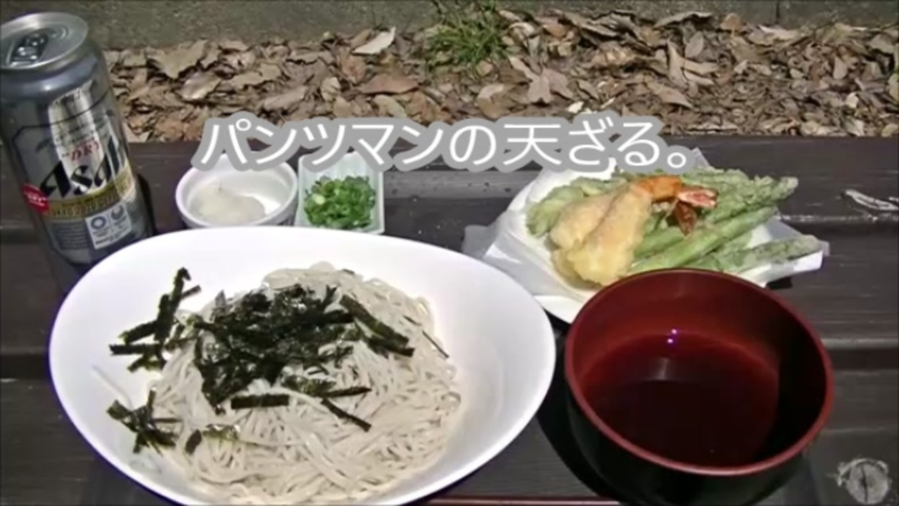 天ざる。<br>市販の蕎麦を茹でました。つゆも付いて便利。3人前茹でて僕は二人前たべました。<br>天ぷらは、揚げました。海老に衣を大きくつけるのが出来ないので見栄えがいまいち。<br><br>私たちだけの近所の公園で食べました。
