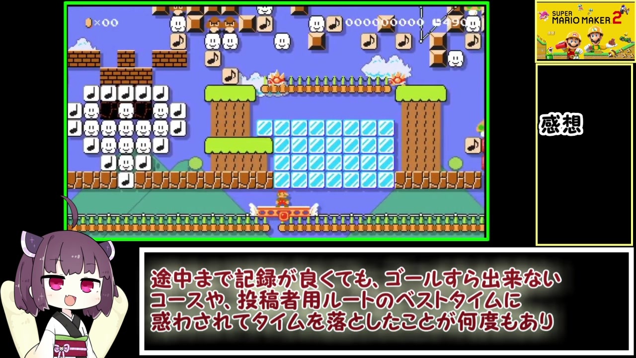 <span style="font-size: 24px;"><strong>世界一位取りました!(R2/4時点)</strong></span><br>RIJ2019ご視聴頂いた方ありがとうございました!<br>同時視聴者数1万5千人でめっちゃ緊張しました!<br><span style="color: #000000; font-size: 13px;">twitch→</span><a href="https://www.twitch.tv/videos/528371797?collection=shLJs-Fk5BXL-w" target="_blank" rel="noopener nofollow">https://www.twitch.tv/videos/528371797?collection=shLJs-Fk5BXL-w</a> 当時のコメント見れる<br>youtube→<a href="https://www.youtube.com/watch?v=QZPU-qegDJA" target="_blank" rel="noopener nofollow">https://www.youtube.com/watch?v=QZPU-qegDJA</a> <br><br><br><span style="color: #000000; font-size: 13px;">記録更新されない限りはふつう難易度は走らない予定です。</span><br>最後のジャンプ地味に難しかったね。要望があれば解説?実況動画作ります。<br><br><span style="color: #000000; font-size: 14px;">※タイマーは自己べのタイムです</span><br><span style="color: #000000; font-size: 14px;"><strong>タイマースタート:はじめるを押した瞬間<br>タイマーストップ:16コース目をクリアした瞬間<br><br>スピードランサイト:</strong></span><span style="color: #006699; font-size: 14px;"><a href="https://www.speedrun.com/smm2#Endless_Mode" target="_blank" rel="noopener nofollow">https://www.speedrun.com/smm2#Endless_Mode</a></span><br><br><br><br><span style="color: #000000; font-size: 14px;"><strong>タイマーでお借りした立ち絵:</strong></span><a href="https://seiga.nicovideo.jp/seiga/im8544766" target="_blank" rel="noopener">im8544766</a><br><br><br><br><br>