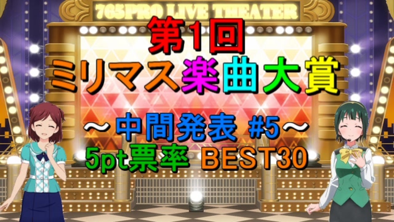 <span style="color: #0000ff; font-size: 13px;"><strong>2020/2/27時点で音源の存在</strong></span>するミリマスのオリジナル楽曲(<span style="color: #00ff00; font-size: 13px;"><strong>計267曲</strong></span>)に対する<br>人気投票企画の中間発表5回目です。今回は<span style="color: #4a86e8; font-size: 13px;"><strong>ユニット・ソロ曲</strong></span>の結果(1000名時点)を<br>集計し、<span style="color: #ff0000; font-size: 13px;"><strong>5pt票率の上位30曲</strong></span>をそろぞれご紹介していきます。<br><br><span style="color: #ff0000; font-size: 18px;"><strong>★最終結果完成しました!</strong></span><br><span style="color: #262626; font-size: 16px;"><strong>①ユニット部門:<a href="https://www.nicovideo.jp/watch/sm37113849" class="watch">sm37113849</a><br>②ソロ部門:<a href="https://www.nicovideo.jp/watch/sm37113873" class="watch">sm37113873</a><br>③総合部門:<a href="https://www.nicovideo.jp/watch/sm37113884" class="watch">sm37113884</a></strong></span><br><br>○告知動画:<a href="https://www.nicovideo.jp/watch/sm36424884" class="watch">sm36424884</a><br>○中間4回目:<a href="https://www.nicovideo.jp/watch/sm36688261" class="watch">sm36688261</a><br><br>●第1回ミリマス楽曲総選挙:<a href="https://www.nicovideo.jp/watch/sm31214180" class="watch">sm31214180</a><br>●第2回ミリマス楽曲総選挙:<a href="https://www.nicovideo.jp/watch/sm33753640" class="watch">sm33753640</a><br>●『アイマス楽曲ランキングシリーズ』:<a href="https://www.nicovideo.jp/mylist/57911966" target="_blank" rel="noopener">mylist/57911966</a>