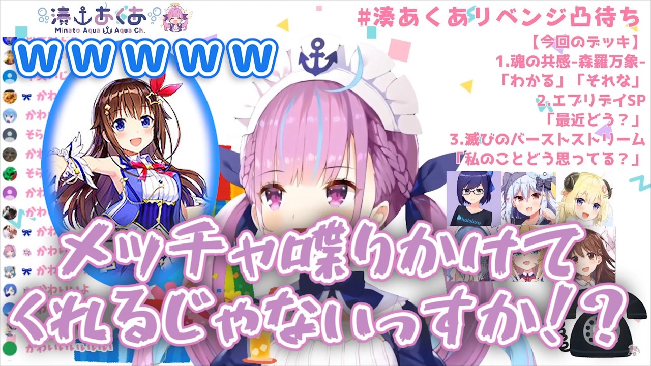 <span style="color: #674ea7;"><strong>【40万人記念企画】コミュ障メイドは凸待ちリベンジで無事に人と仲良くなれるのか【 #湊あくあリベンジ凸待ち 】</strong></span><br><a href="https://www.youtube.com/watch?v=zug2Ud-eqLw" target="_blank" rel="noopener nofollow">https://www.youtube.com/watch?v=zug2Ud-eqLw</a><br><br><span style="color: #ff9900;"><strong>【#桐生ココ】あさココLIVEニュース!4月23日【#ココここ】</strong></span><br><a href="https://www.youtube.com/watch?v=bW-DI1gN5Xo" target="_blank" rel="noopener nofollow">https://www.youtube.com/watch?v=bW-DI1gN5Xo</a><br><br>【切り抜きまとめ】<br><span style="color: #001835;">そら先輩にホラゲに誘われた時のことを語る湊あくあ</span><br><a href="https://www.nicovideo.jp/watch/sm36746021" class="watch">sm36746021</a><br><span style="color: #001835;">湊あくあ、凸待ちに女神が来たことにより実質勝ちを主張する</span><br><a href="https://www.nicovideo.jp/watch/sm36447026" class="watch">sm36447026</a><br><span style="color: #001835;">ときのそら、湊あくあをべた褒めする</span><br><a href="https://www.nicovideo.jp/watch/sm36310269" class="watch">sm36310269</a><br><span style="color: #001835;">湊あくあ、ときのそらからご指名を受ける</span><br><a href="https://www.nicovideo.jp/watch/sm36188733" class="watch">sm36188733</a><br><span style="color: rgba(0, 0, 0, 0.87); font-size: 15px;">レジスタンスリーダーとしてときのそらに決闘を申し込むもだだ滑りしボロボロになる湊あくあ</span><br><a href="https://www.nicovideo.jp/watch/sm34563942" class="watch">sm34563942</a><br><br><span style="color: #b4a7d6; font-size: 16px;"><strong>Aqua Ch. 湊あくあ</strong></span><br><a href="https://www.youtube.com/channel/UC1opHUrw8rvnsadT-iGp7Cg" target="_blank" rel="noopener nofollow">https://www.youtube.com/channel/UC1opHUrw8rvnsadT-iGp7Cg</a><br><br><span style="color: #3c78d8; font-size: 16px;"><strong>SoraCh. ときのそらチャンネル</strong></span><br><a href="https://www.youtube.com/channel/UCp6993wxpyDPHUpavwDFqgg" target="_blank" rel="noopener nofollow">https://www.youtube.com/channel/UCp6993wxpyDPHUpavwDFqgg</a>