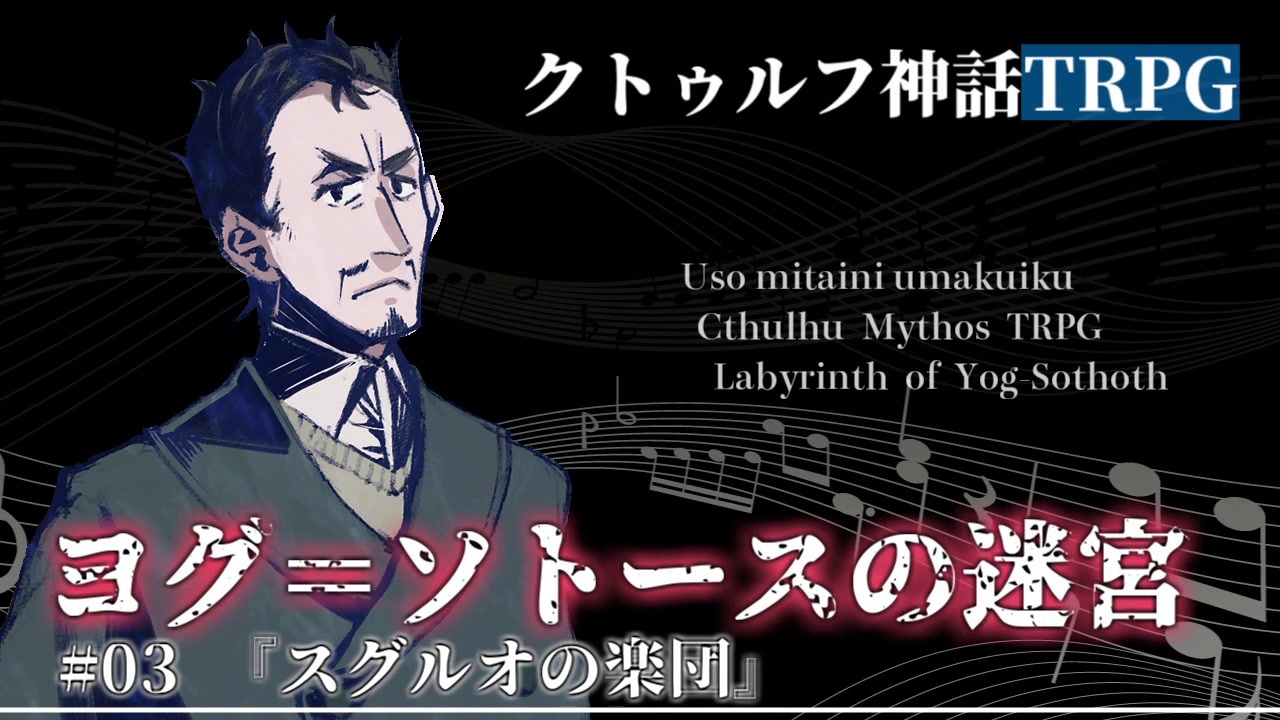 「スグルオって知ってる?」「スグル? キン肉マンのことだよね」<br>リプレイでは省かれてますが、そんな会話をしていたような覚えがあります。<br><br><span style="color: #ff0000; font-size: 18px;"><strong>エアコミケ参加中!</strong></span>新刊情報はこちら!(<span style="color: #000000; font-size: 14px;"><a href="https://ch.nicovideo.jp/article/ar1571822" target="_blank" rel="noopener">ar1571822</a></span>)(<a href="https://www.nicovideo.jp/watch/sm36775804" class="watch">sm36775804</a>)<br><br>※1:「ヨグ=ソトースの迷宮」はうそうま卓の同人誌1巻にシナリオ・リプレイが掲載されているものです。先の展開のネタバレはお控えください。<br>※2:↑なんですけど、同人誌掲載シナリオと本動画はちょっと内容が違います。プロトタイプだから!<br><br>前:<a href="https://www.nicovideo.jp/watch/sm36763622" class="watch">sm36763622</a> / 次:(4話:5/4)<br><br />【 うそうま卓シナリオ等まとめ:<a href="https://usouma.booth.pm/" target="_blank" rel="noopener nofollow">https://usouma.booth.pm/</a> 】<br><br>マイリスト:<a href="https://www.nicovideo.jp/mylist/57250859" target="_blank" rel="noopener">mylist/57250859</a> <a href="https://www.nicovideo.jp/mylist/67175059" target="_blank" rel="noopener">mylist/67175059</a><br>ツイッター <a href="https://twitter.com/shitouba_trpg" target="_blank" rel="noopener nofollow">https://twitter.com/shitouba_trpg</a><br>連絡先 usouma1010@gmail.com<br><br>クトゥルフ神話TRPG<br>第1チーム立ち絵:転(くるり)さん <a href="https://twitter.com/kururirura" target="_blank" rel="noopener nofollow">https://twitter.com/kururirura</a><br>第2チーム立ち絵:茨乃(しの)さん <a href="https://twitter.com/sino_eefy" target="_blank" rel="noopener nofollow">https://twitter.com/sino_eefy</a><br>第3チーム立ち絵:スイさん <a href="https://twitter.com/moe_sui" target="_blank" rel="noopener nofollow">https://twitter.com/moe_sui</a><br>
