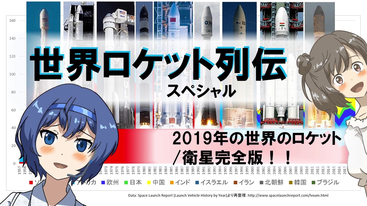 <span style="color: #000000; font-size: 14px;">お久しぶりです!</span>去年<a href="https://www.nicovideo.jp/watch/sm34512242" class="watch">sm34512242</a> に引き続き、今回も2019年に打ちあがった世界のロケットと衛星を、つづみちゃんたちが徹底的に紹介します!<br><span style="color: #000000; font-size: 14px;">世界でどんなロケットが、どのような衛星を積んで、何のために宇宙に飛び立っているのでしょうか?<br>後編もUpしました!! <a href="https://www.nicovideo.jp/watch/sm36908430" class="watch">sm36908430</a> ロシア、ヨーロッパ、インド、イラン、日本はこちらで!</span><br><br>宇宙開発解説マイリス <span style="color: #006699; font-size: 14px;">mylist/</span>66566849 <br>関連動画:<a href="https://www.nicovideo.jp/watch/sm35742753" class="watch">sm35742753</a> 世界ロケット列伝 小型衛星打ち上げロケット大特集!【第2回】<br><br><span style="color: #000000; font-size: 14px;">お借りしているささらちゃん&つづみちゃんの立ち絵:ある名 様 </span><br>BGM:コンテンツツリー及びH/MIX gallery "草原を行く"”作戦会議”<br>====================<br><span style="color: #000000; font-size: 14px;">本動画の元データ:基本的には動画内で記載。それ以外は以下</span><br>Gunter Krebs氏:Gunter's Space Page <span style="color: #006699; font-size: 14px;"><a href="https://space.skyrocket.de/" target="_blank" rel="noopener nofollow">https://space.skyrocket.de/</a></span><br><br><span style="color: #000000; font-size: 14px;">PS:KSPでロケット飛ばしてます(最近ご無沙汰ですが…)~よろしければぜひ。</span><br><span style="color: #006699; font-size: 14px;"><a href="https://www.nicovideo.jp/mylist/59573448" target="_blank" rel="noopener">mylist/59573448</a></span>