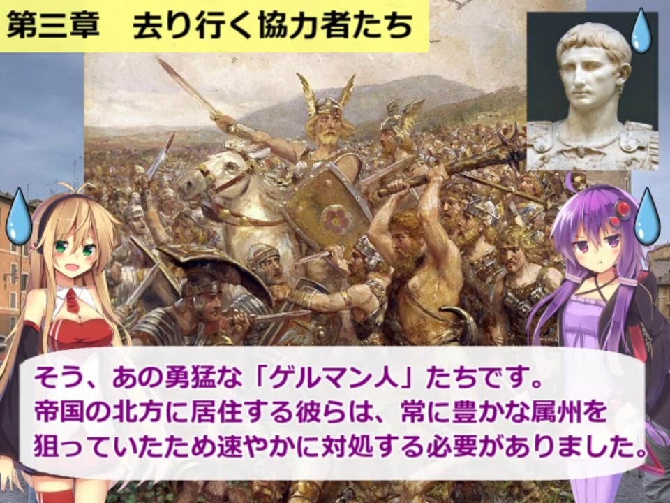 「アウグストゥス」編、最終回になります! (戦争・外交・後継者問題がメイン)<br>余り知られることの少ない、ローマ帝国初代皇帝の<br>「闘いと悲劇の後半生」をお届けできれば幸いです。<br><br>これでも、泣く泣くカットしたエピソードはたくさんあるので、<br>少しでも彼に興味を持っていただけた方は是非調べてみてください!<br><br>色々なトラブル (データ消失、コロナ禍 etc.) の影響で投稿が大幅に遅れて<br>大変申し訳ございませんでした ...<br><br><a href="#" class="seekTime" data-seekTime="0:00" onclick="seekNicoPlayer('#0:00'); return false;">#0:00</a><span style="color: #000000;"> プロローグ・導入 <a href="#" class="seekTime" data-seekTime="1:56" onclick="seekNicoPlayer('#1:56'); return false;">#1:56</a> 第一章 治世の始まり <a href="#" class="seekTime" data-seekTime="7:39" onclick="seekNicoPlayer('#7:39'); return false;">#7:39</a> 第ニ章 東方政策<br><a href="#" class="seekTime" data-seekTime="11:07" onclick="seekNicoPlayer('#11:07'); return false;">#11:07</a> 第三章 去り行く協力者たち <a href="#" class="seekTime" data-seekTime="17:35" onclick="seekNicoPlayer('#17:35'); return false;">#17:35</a> 第四章 家庭内の不幸 <br><a href="#" class="seekTime" data-seekTime="22:43" onclick="seekNicoPlayer('#22:43'); return false;">#22:43</a> 特別章 キリスト降誕 <a href="#" class="seekTime" data-seekTime="25:13" onclick="seekNicoPlayer('#25:13'); return false;">#25:13</a> 第五章 内憂外患の連続<br><a href="#" class="seekTime" data-seekTime="29:45" onclick="seekNicoPlayer('#29:45'); return false;">#29:45</a> 特別章 トイトブルク森の惨劇 <a href="#" class="seekTime" data-seekTime="33:58" onclick="seekNicoPlayer('#33:58'); return false;">#33:58</a> 第六章 「喜劇」の幕引き<br><a href="#" class="seekTime" data-seekTime="38:28" onclick="seekNicoPlayer('#38:28'); return false;">#38:28</a> エピローグ・参考文献&素材紹介 <a href="#" class="seekTime" data-seekTime="39:55" onclick="seekNicoPlayer('#39:55'); return false;">#39:55</a> 番外コーナー<br><br>●前編 (帝国誕生・内政編) → </span><a href="https://www.nicovideo.jp/watch/sm36166102" class="watch">sm36166102</a><span style="color: #000000;"> part2 (二代皇帝の治世) → </span><a href="https://www.nicovideo.jp/watch/sm37490182" class="watch">sm37490182</a><br><span style="color: #000000;"> ローマ帝国解説リスト → </span><span style="color: #262626;"><a href="https://www.nicovideo.jp/mylist/59073700" target="_blank" rel="noopener">mylist/59073700</a> 補足静画 →</span><span style="color: #006699;"> </span><a href="https://seiga.nicovideo.jp/seiga/im10398722" target="_blank" rel="noopener">im10398722</a><br><br><span style="color: #ff0000; font-size: 14px;">●いのっちHPを開設いたしました!</span><span style="color: #000000; font-size: 14px;"> → </span><span style="color: #006699; font-size: 14px;"><a href="https://inocchi-douga.com/" target="_blank" rel="noopener nofollow">https://inocchi-douga.com/</a></span><br><span style="color: #006699;"> </span><span style="color: #000000;">いのっちコミュニティ </span><span style="color: #006699;">co3096574 </span><span style="color: #000000;">ついったー @inocchi_0515</span>