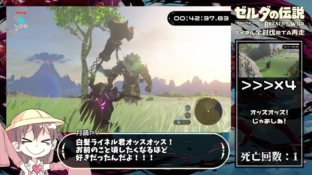 <span style="color: #ff0000; font-size: 24px;"><strong>再走の英傑</strong></span><br><span style="color: #ff0000;"><strong>一時間更新したので初投稿です。</strong></span><br><br>この動画は<br>【ゼルダの伝説 ブレスオブザワイルド】ライネル全討伐RTA【3時間30分30秒】<br>↳<a href="https://www.nicovideo.jp/watch/sm36635884" class="watch">sm36635884</a>の再走RTAとなります。<br>初めてご覧になる方は先に上記のRTAを<br>ご覧になってから見るとすこし楽しめるかもしれません。<br><br>視聴者姉貴たちの厚い要望にお応えしてアマゾンほしいものリストを捻出しました。オメグミチョウダイ<br><a href="https://www.amazon.jp/hz/wishlist/ls/3NTG6GMZ407YT?ref_=wl_share" target="_blank" rel="noopener nofollow">https://www.amazon.jp/hz/wishlist/ls/3NTG6GMZ407YT?ref_=wl_share</a><br><br>【ルール】<br>「はじめから」を選択した瞬間から<br>全23体の<span style="color: #ff0000;"><strong>ライネルを倒した(HPが0になった)瞬間</strong></span>までを計測<br><br>【環境】<br>ぱそこん:ねぬいーしー<br>キャプボ:I-O Data GV-USB3/HD<br>ゲーム機:Nintendo Switch<br><br>次Part:<a href="https://www.nicovideo.jp/watch/sm36886877" class="watch">sm36886877</a><br><br>★biimシステムリスペクトです★<br>★淫夢要素はないです★<br><br>★お借りした素材★<br>月読アイちゃん先輩立ち絵(ゆぬきうた 様) ☛<a href="https://seiga.nicovideo.jp/seiga/im9925592" target="_blank" rel="noopener">im9925592</a>