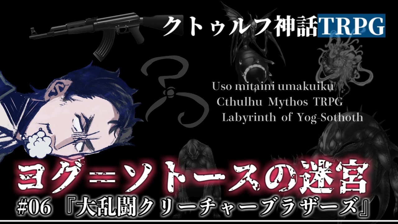 PLはなんとなくわかってるのにダイスが振るわなくてPCがわからないこと。あると思います。<br><br><span style="color: #ff0000; font-size: 18px;"><strong>エアコミケおつかれさまでした!</strong></span>新刊情報はこちら!(<span style="color: #000000; font-size: 14px;"><a href="https://ch.nicovideo.jp/article/ar1571822" target="_blank" rel="noopener">ar1571822</a></span>)(<a href="https://www.nicovideo.jp/watch/sm36775804" class="watch">sm36775804</a>)<br><br>※1:「ヨグ=ソトースの迷宮」はうそうま卓の同人誌1巻にシナリオ・リプレイが掲載されているものです。先の展開のネタバレはお控えください。<br>※2:↑なんですけど、同人誌掲載シナリオと本動画はちょっと内容が違います。プロトタイプだから!<br><br>前:<a href="https://www.nicovideo.jp/watch/sm36803056" class="watch">sm36803056</a> / 次:(7話:5/7)<br />【 うそうま卓シナリオ等まとめ:<a href="https://usouma.booth.pm/" target="_blank" rel="noopener nofollow">https://usouma.booth.pm/</a> 】<br><br>マイリスト:<a href="https://www.nicovideo.jp/mylist/57250859" target="_blank" rel="noopener">mylist/57250859</a> <a href="https://www.nicovideo.jp/mylist/67175059" target="_blank" rel="noopener">mylist/67175059</a><br>ツイッター <a href="https://twitter.com/shitouba_trpg" target="_blank" rel="noopener nofollow">https://twitter.com/shitouba_trpg</a><br>連絡先 usouma1010@gmail.com<br><br>クトゥルフ神話TRPG<br>第1チーム立ち絵:転(くるり)さん <a href="https://twitter.com/kururirura" target="_blank" rel="noopener nofollow">https://twitter.com/kururirura</a><br>第2チーム立ち絵:茨乃(しの)さん <a href="https://twitter.com/sino_eefy" target="_blank" rel="noopener nofollow">https://twitter.com/sino_eefy</a><br>第3チーム立ち絵:スイさん <a href="https://twitter.com/moe_sui" target="_blank" rel="noopener nofollow">https://twitter.com/moe_sui</a><br>