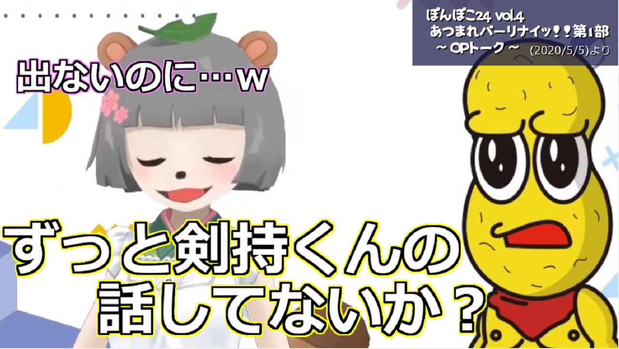 不在なのに濃厚<br><br>ぽんぽこ <a href="https://www.youtube.com/channel/UC1EB8moGYdkoZQfWHjh7Ivw?sub_confirmation=1" target="_blank" rel="noopener nofollow">https://www.youtube.com/channel/UC1EB8moGYdkoZQfWHjh7Ivw?sub_confirmation=1</a><br>ピーナッツくん<a href="https://www.youtube.com/channel/UCmgWMQkenFc72QnYkdxdoKA?sub_confirmation=1" target="_blank" rel="noopener nofollow">https://www.youtube.com/channel/UCmgWMQkenFc72QnYkdxdoKA?sub_confirmation=1</a><br>剣持刀也 <a href="https://www.youtube.com/channel/UCv1fFr156jc65EMiLbaLImw?sub_confirmation=1" target="_blank" rel="noopener nofollow">https://www.youtube.com/channel/UCv1fFr156jc65EMiLbaLImw?sub_confirmation=1</a><br><br>▼元動画<br>【24時間生放送】第1部 ぽんぽこ24 vol.4 あつまれパーリナイッ!!(2020/5/5)<br><a href="https://youtu.be/YgZAwf9Zk-w" target="_blank" rel="noopener nofollow">https://youtu.be/YgZAwf9Zk-w</a><br>【TETRIS 99】1位になるまで終われない配信【耐久】(2020/5/6)<br><a href="https://youtu.be/cvUrLiLvn1U" target="_blank" rel="noopener nofollow">https://youtu.be/cvUrLiLvn1U</a><br>24時間生放送ありがとう~~!!後夜祭!!(2020/5/7)<br><a href="https://youtu.be/L7FZ_WLiuKg" target="_blank" rel="noopener nofollow">https://youtu.be/L7FZ_WLiuKg</a><br><br>▼該当箇所<br>(4:55~)初収益の話~剣持グラスが割れた話<br><a href="https://youtu.be/YgZAwf9Zk-w?t=295" target="_blank" rel="noopener nofollow">https://youtu.be/YgZAwf9Zk-w?t=295</a><br>(7:08:25~)ぽこピー批評 ~beyond~ 第一回の振り返り<br><a href="https://youtu.be/YgZAwf9Zk-w?t=25702" target="_blank" rel="noopener nofollow">https://youtu.be/YgZAwf9Zk-w?t=25702</a><br>(8:17:33~)NGシーン ダルゴナコーヒー<br><a href="https://youtu.be/YgZAwf9Zk-w?t=29852" target="_blank" rel="noopener nofollow">https://youtu.be/YgZAwf9Zk-w?t=29852</a><br>(8:00~)凸しなかった理由<br><a href="https://youtu.be/cvUrLiLvn1U?t=480" target="_blank" rel="noopener nofollow">https://youtu.be/cvUrLiLvn1U?t=480</a><br>(59:07~)煽るピーナッツくん<br><a href="https://youtu.be/L7FZ_WLiuKg?t=3547" target="_blank" rel="noopener nofollow">https://youtu.be/L7FZ_WLiuKg?t=3547</a><br><br><br>▼剣持グラス出演動画<br>萌え声VTuberが話題のダルゴナコーヒーを作るんだお!<br><a href="https://youtu.be/sjzs8gyrY3U" target="_blank" rel="noopener nofollow">https://youtu.be/sjzs8gyrY3U</a><br><br>▼ぽんぽこ4<br>【あつまれ!】みんな家で過ごそう4時間生放送SP!!!<br><a href="https://youtu.be/adT5smu5TP8" target="_blank" rel="noopener nofollow">https://youtu.be/adT5smu5TP8</a><br><br>▼刀ピークリスマス<br>とうぴークリスマス(2018/12/25)<br><a href="https://youtu.be/jx1rZ2PMhFY" target="_blank" rel="noopener nofollow">https://youtu.be/jx1rZ2PMhFY</a><br>とうぴークリスマス2019(2019/12/25)<br><a href="https://youtu.be/DiGN6MY-gGQ" target="_blank" rel="noopener nofollow">https://youtu.be/DiGN6MY-gGQ</a>