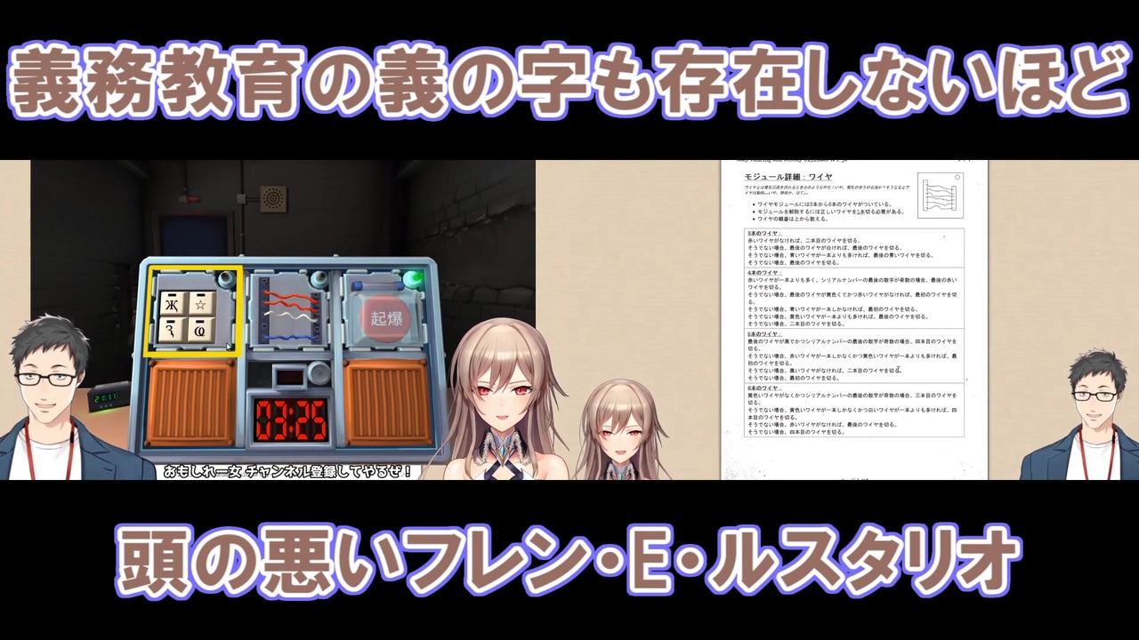 マジで今の今までどうやって生きてきたのこの子…<br>やしきずもよう噴火しとる<br><br>本家参考動画<br>・フレン・E・ルスタリオ視点<br>【Keep Talking and Nobody Explodes】爆弾解除?余の裕です【フレン・E・ルスタリオ/社築/にじさんじ】<br><a href="https://youtu.be/8ILWUUFnLnw" target="_blank" rel="noopener nofollow">https://youtu.be/8ILWUUFnLnw</a><br>・社築視点<br>【Keep Talking and Nobody Explodes】安易な爆発オチは避けたい【にじさんじ/社築/フレン・E・ルスタリオ】<br><a href="https://youtu.be/mprS8qOTXfM" target="_blank" rel="noopener nofollow">https://youtu.be/mprS8qOTXfM</a><br><br>参考チャンネル<br>・フレン・E・ルスタリオ<br><a href="https://www.youtube.com/channel/UCuep1JCrMvSxOGgGhBfJuYw" target="_blank" rel="noopener nofollow">https://www.youtube.com/channel/UCuep1JCrMvSxOGgGhBfJuYw</a><br>・社築<br><a href="https://www.youtube.com/channel/UCKMYISTJAQ8xTplUPHiABlA" target="_blank" rel="noopener nofollow">https://www.youtube.com/channel/UCKMYISTJAQ8xTplUPHiABlA</a><br><br>参考元主Twitter<br>・フレン・E・ルスタリオ<br><a href="https://twitter.com/furen_2434" target="_blank" rel="noopener nofollow">https://twitter.com/furen_2434</a><br>・社築<br><a href="https://twitter.com/846kizuQ" target="_blank" rel="noopener nofollow">https://twitter.com/846kizuQ</a><br><br>Midwinter さん<br>96960 さん<br>msd さん<br>モザンビーク二刀流 さん<br>うわばみ さん<br>buchi さん<br>広告ありがとうございます<br><br>ニコニコのダイコンマンリスト<br>「バーチャルYouTuberシリーズ」↓<br><a href="https://www.nicovideo.jp/mylist/62551838" target="_blank" rel="noopener">mylist/62551838</a><br>「バーチャルYouTuberシリーズ2」↓<br><a href="https://www.nicovideo.jp/mylist/67858437" target="_blank" rel="noopener">mylist/67858437</a><br><br>YouTubeのダイコンマンチャンネル<br><a href="https://www.youtube.com/channel/UCkpfR11cG2kk9KTJijWCJfg" target="_blank" rel="noopener nofollow">https://www.youtube.com/channel/UCkpfR11cG2kk9KTJijWCJfg</a><br><br>ダイコンマンのTwitter<br><a href="https://twitter.com/Daikon_Man_V" target="_blank" rel="noopener nofollow">https://twitter.com/Daikon_Man_V</a>
