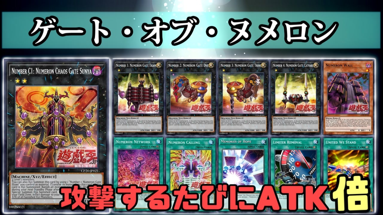 <strong>COLLECTION PACK 2020</strong>で登場<br><span style="color: #ff9900; font-size: 24px;"><strong>【ヌメロン】</strong></span><br>・ZEXALで<strong>ドン・サウザンド</strong>が使用したテーマがOCG化!<br>・<strong>【ヌメロン・ネットワーク】</strong>1枚でNo.1~4のヌメロンが展開でき,最高で攻撃力8000になるモンスターを出すとんでもカード。<br>また1枚で<strong>【SNo.0 ホープ・ゼアル】</strong>リンク4の<strong>【召命の神弓-アポロウーサ】</strong>という妨害カードを召喚できるので様々な使い方ができておもしろいカードだと思った!<br>【感想】<br>・攻撃力を上げる効果に注目して<strong>リミッター解除</strong>や<strong>団結の力</strong>で殴るだけで勝てる!<br>・<strong>ヌメロン・ダイレクト</strong>の発動条件が自分の場にモンスターが存在すると発動できないので,自身をリリースして発動できるカードが便利そう!<br><br><span style="color: #1155cc; font-size: 24px;"><strong>1枚でホープ・ゼアルは強すぎ!</strong></span><br><span style="color: #cc0000; font-size: 24px;"><strong>希望の記憶で4枚カードがドローできる</strong></span><br><span style="color: #38761d; font-size: 24px;"><strong>機械だからリミッター解除</strong></span><br><span style="color: #000000; font-size: 14px;">マイリス 動画まとめ </span><span style="color: #006699; font-size: 14px;"><a href="https://www.nicovideo.jp/mylist/53562110" target="_blank" rel="noopener">mylist/53562110</a></span><span style="color: #000000; font-size: 14px;"> 前 教導 </span><a href="https://www.nicovideo.jp/watch/sm36696496" class="watch">sm36696496</a><br><br>動画にコメント頂けるとうれしいです!