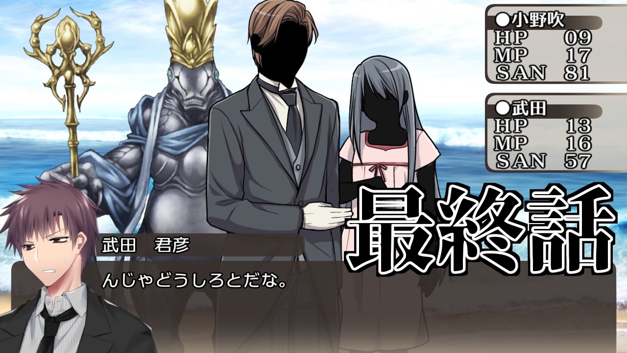 本作は、「 株式会社アークライト 」及び「株式会社KADOKAWA」が権利を有する『新クトゥルフ神話TRPG』の二次創作物です。<br><br>Call of Cthulhu is copyright ©1981, 2015, 2019 by Chaosium Inc. ;all rights reserved. Arranged by Arclight Inc.<br>Call of Cthulhu is a registered trademark of Chaosium Inc.<br>PUBLISHED BY KADOKAWA CORPORATION 「新クトゥルフ神話TRPG ルールブック」<br><br>こういう時もある……。<br><br>テストプレイ時の様子なので、バランスも色々あれですが。<br>個人的には武田のスーツ立ち絵を使えたので満足です。<br><br>反省会という名の雑談おまけを作るかどうしようか、微妙に悩みます。<br>まぁ、気が向いたら……?<br><br>シナリオ集Cuatro miedosより、もう一本動画化です。<br><a href="https://colorcat.booth.pm/items/1923930" target="_blank" rel="noopener nofollow">https://colorcat.booth.pm/items/1923930</a><br>イエローサブマリン様の各店舗で既に販売が始まっていて、BOOTH様でも準備中です。<br>どうぞよろしくお願いします。<br>先にシナリオを見た方は、ネタバレ部分はお口チャックしておいてね!<br><br>特殊ルールの第7版セッションです。<br>第6版の継続探索者が登場しますが、IF的な立ち位置のセッションとなります。<br>特殊処理については、過去編(淡い軌跡シリーズ)を参照してください。<br><br>まだ新しいルールに慣れていないこともあり、ミス等も多くあるかと思いますが、何卒ご了承ください。<br>また身内卓につきハウスルールましましで色々緩いですが、そちらもあわせてご容赦ください。<br><br>広告して下さる皆さん、いつもありがとうございます。<br>まとめてのお礼となりまして恐縮ですが、今後とも頑張ります。<br><br>[新クトゥルフ神話TRPG動画一覧]<a href="https://www.nicovideo.jp/mylist/67362940" target="_blank" rel="noopener">mylist/67362940</a><br>[クトゥルフ神話TRPG動画一覧]<a href="https://www.nicovideo.jp/mylist/60110794" target="_blank" rel="noopener">mylist/60110794</a><br>[part1動画一覧]<a href="https://www.nicovideo.jp/mylist/60289921" target="_blank" rel="noopener">mylist/60289921</a><br>[今作mylist]<a href="https://www.nicovideo.jp/mylist/68225964" target="_blank" rel="noopener">mylist/68225964</a><br><br>[前]<a href="https://www.nicovideo.jp/watch/sm36850786" class="watch">sm36850786</a><br>[次回作]<a href="https://www.nicovideo.jp/watch/sm36882190" class="watch">sm36882190</a>(DX3rd)<br /><br>色猫卓ポータルサイト<br>→<a href="https://marchocias.xsrv.jp/colorcat/index.html" target="_blank" rel="noopener nofollow">https://marchocias.xsrv.jp/colorcat/index.html</a><br>動画で紹介しても良い支援絵は #いろねこあーと で!<br><br>ピッコマで小説連載開始しました!<br>魔族生まれの聖女様!? 著:黒猫ている<br><a href="https://piccoma.com/web/product/156938" target="_blank" rel="noopener nofollow">https://piccoma.com/web/product/156938</a>