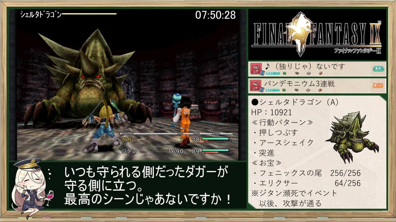 ジタンの過去や存在がなんであろうと<br>『今さら疑うものか!私はお前を信じる!!』<br><br>それではお聞きください。独りじゃ、ないです。<br><br>【GAME】 <br>FINAL FANTASY Ⅸ(ファイナルファンタジー9)<br>Steam(PC版)<br><br>【レギュレーション】<br>・計測区間:NEW GAME選択~THE END表示<br>・ムービースキップ有<br>・オートセーブ使用<br>・連射コントローラ使用<br>・公式チート使用不可<br>※背景高画質化mod(Mogri mod)を導入しています<br><br>【<a href="https://www.nicovideo.jp/mylist/67167456" target="_blank" rel="noopener">mylist/67167456</a>】 <br>PREV≫<span style="font-size: 14px;"><a href="https://www.nicovideo.jp/watch/sm36782341" class="watch">sm36782341</a></span><br>NEXT≫<span style="font-size: 14px;"><a href="https://www.nicovideo.jp/watch/sm36958579" class="watch">sm36958579</a></span><br><br>Part.1≫<a href="https://www.nicovideo.jp/watch/sm36151772" class="watch">sm36151772</a><br><br><br>☆こちらもどうぞ★<br>≪前作≫42ターンで連邦を救う戦場のヴァルキュリア4<br>≫<a href="https://www.nicovideo.jp/watch/sm35571357" class="watch">sm35571357</a><br><br>≪前作RTA≫ドラゴンモエストⅥバーバラルートRTA_7:38:44_Part.1<br>≫<a href="https://www.nicovideo.jp/watch/sm35425017" class="watch">sm35425017</a><br><br>Other Cielo’s Title <br>【<a href="https://www.nicovideo.jp/mylist/50418741" target="_blank" rel="noopener">mylist/50418741</a> 】<br><br>twitter <a href="https://twitter.com/Cielo_Polo" target="_blank" rel="noopener nofollow">https://twitter.com/Cielo_Polo</a>