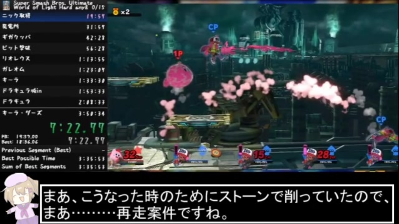 スマブラは初投稿です。<br>動画投稿時点で、Speedrun.com上の記録にて世界一位の記録になります。<br><br>計測開始:「むずかしい」を選択した瞬間<br>計測終了:キーラ&ダーズ戦で最後の攻撃を当てた瞬間<br>使用ハード:Nintendo Switch<br><br>割とガバが多いです。<br><br>ここが最初←前 次→<a href="https://www.nicovideo.jp/watch/sm36903464" class="watch">sm36903464</a><br><br>配信コミュ→co3812574<br>Twitch→kmbyukarin<br><追記><br>「RTAだけ見たい」等のお声を頂いたので、配信版のURLを追記しました。<br>【<a href="https://www.twitch.tv/videos/618875878" target="_blank" rel="noopener nofollow">https://www.twitch.tv/videos/618875878</a> 】<br><br>Twitter→@khrn_love<br><br>立ち絵はこはる(Twitter:@koharu_Mykl)様に頂きました。