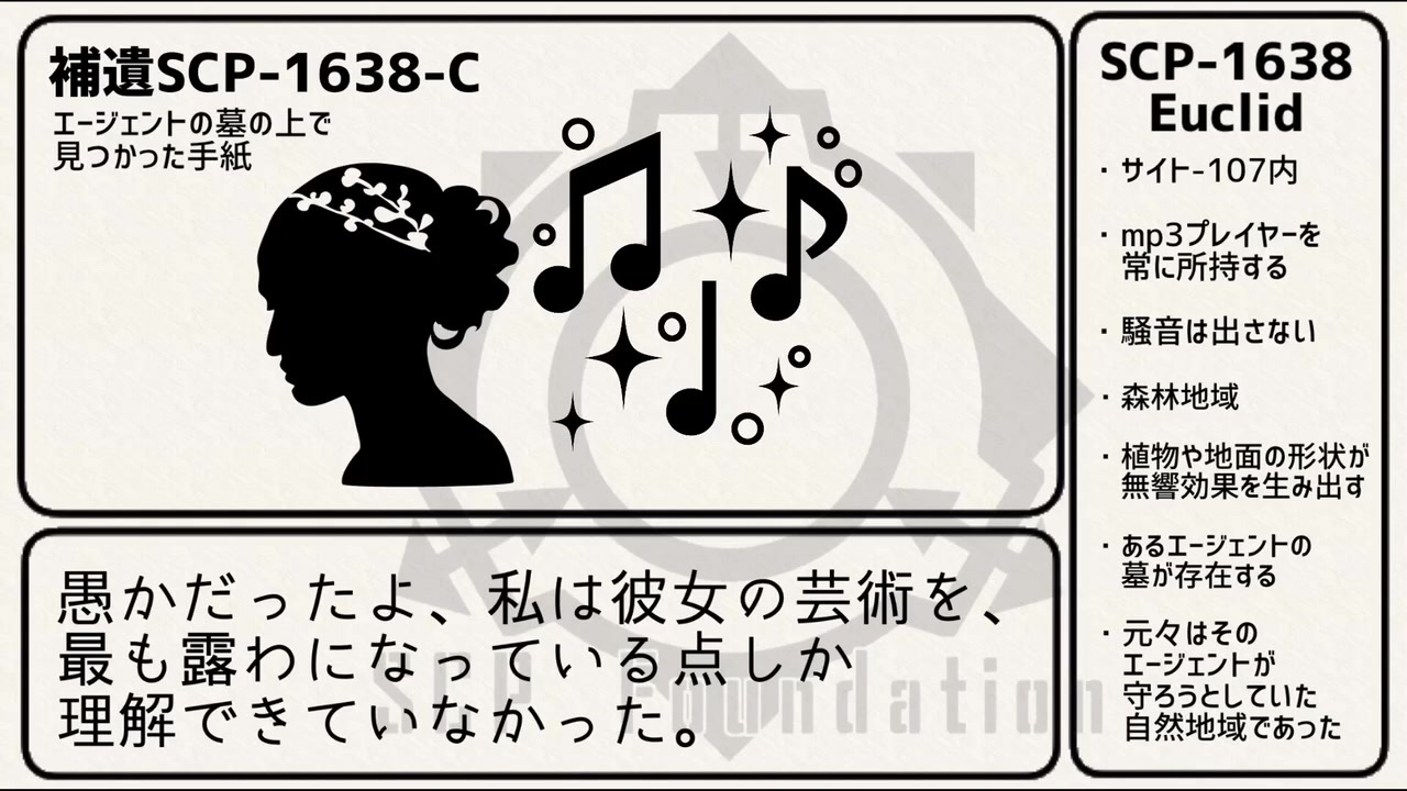 累計23作目です。<br><br><strong>「彼女には、音の煌めくような静寂がふさわしい。」</strong><br><br>Author: Myriad<br>Title: SCP-1638 - 静寂 <br>Source: <a href="http://www.scp-wiki.net/scp-1638" target="_blank" rel="noopener nofollow">http://www.scp-wiki.net/scp-1638</a><br>CC BY-SA 3.0<br><br>※カリフォルニア州の画像がCCだったので<br>作成者:TUSB様<br>カリフォルニア州のある位置<br><a href="https://ja.wikipedia.org/wiki/%E3%82%AB%E3%83%AA%E3%83%95%E3%82%A9%" target="_blank" rel="noopener nofollow">https://ja.wikipedia.org/wiki/%E3%82%AB%E3%83%AA%E3%83%95%E3%82%A9%</a><br>E3%83%AB%E3%83%8B%E3%82%A2%E5%B7%9E<br>CC BY-SA 3.0<br />—————————————————————————————————————————<br><span style="color: #ff0000; font-size: 18px;"><strong><<イセエビのSCP解説動画シリーズ>></strong></span><br><span style="font-size: 18px;"><strong><a href="https://www.nicovideo.jp/series/68234" target="_blank" rel="noopener nofollow">https://www.nicovideo.jp/series/68234</a></strong></span><br><span style="color: #ff0000; font-size: 18px;"><strong><<イセエビの最新作>></strong></span><br><span style="font-size: 16px;"><strong>SCP-1375-JP『漢の荒波 - 頑固一徹反ミーム一本釣り』【ゆっくり解説】</strong></span><span style="font-size: 18px;"><strong><a href="https://www.nicovideo.jp/watch/sm38425129" class="watch">sm38425129</a></strong></span><br>—————————————————————————————————————————<br>Twitter→<a href="https://mobile.twitter.com/Be_to_be_eaten" target="_blank" rel="noopener nofollow">https://mobile.twitter.com/Be_to_be_eaten</a><br>Youtube→<a href="https://m.youtube.com/channel/UCvbb-AW7AyvjCDtSNDTF8lw" target="_blank" rel="noopener nofollow">https://m.youtube.com/channel/UCvbb-AW7AyvjCDtSNDTF8lw</a>