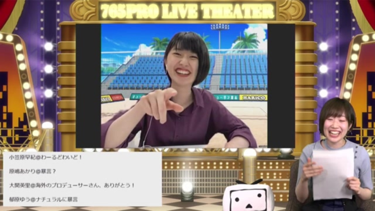 「THE IDOLM@STER MILLION LIVE!」MILLIONSTARS特別生配信~手作りのThank You!~(DAY1) 2/7<br>2020/05/23(土) 16:30開始 <a href="https://live.nicovideo.jp/watch/lv325958653" target="_blank" rel="noopener">lv325958653</a><br><br>MC:田所あずさ (最上静香 役)<br>ゲスト:駒形友梨 (高山紗代子 役)<br><br>1 <a href="https://www.nicovideo.jp/watch/sm36939830" class="watch">sm36939830</a> 愛美<br>2 <a href="https://www.nicovideo.jp/watch/sm36914944" class="watch">sm36914944</a> 駒形友梨 (ここ)<br>3 <a href="https://www.nicovideo.jp/watch/sm36948702" class="watch">sm36948702</a><br>4 <a href="https://www.nicovideo.jp/watch/sm36922985" class="watch">sm36922985</a> 渡部優衣<br>5 <a href="https://www.nicovideo.jp/watch/sm36949307" class="watch">sm36949307</a><br>6 <a href="https://www.nicovideo.jp/watch/sm36923879" class="watch">sm36923879</a><br>7 <a href="https://www.nicovideo.jp/watch/sm36949691" class="watch">sm36949691</a> 佐藤貴文<br>