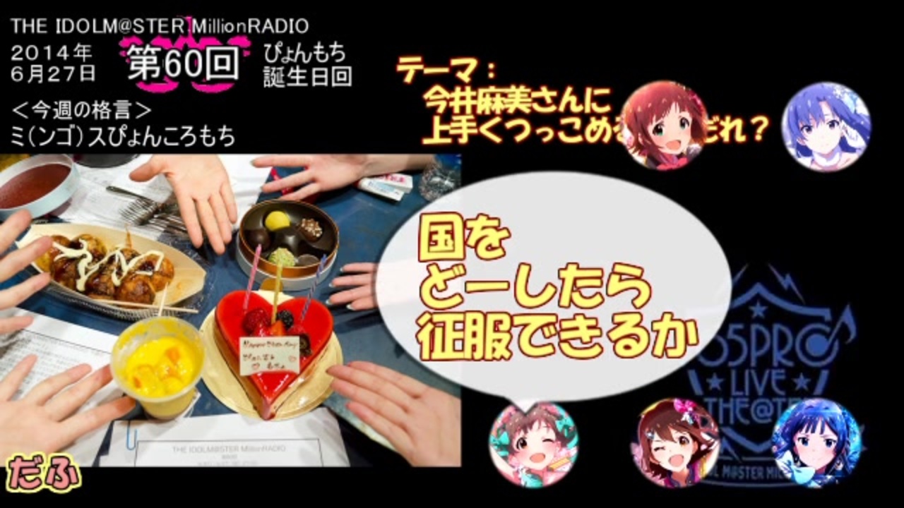 ミリシタのアライブファクター実装記念。<br><br><span style="font-size: 14px;">アイドルマスターミリオンライブのラジオ「ミリラジ」の</span><br>今井さんサプライズゲスト<span style="font-size: 14px;">回です。</span><br><br>ラジオの趣旨通りにボケまくるミンゴスさんに<br>ぴょんころもちがキチンとつっこめるのか…<span style="color: #4d5156; font-size: 14px;">ヾ(・ε・。)ムリダヨネ</span><br><br><span style="font-size: 14px;">もしよろしければこちらもどうぞ<br>【ミリラジ2013単発まとめ】<br> ・第9回 初ナンス → <a href="https://www.nicovideo.jp/watch/sm36687111" class="watch">sm36687111</a><br> ・第13回 初みっく</span><span style="color: #000000; font-size: 14px;"> → </span><span style="font-size: 14px;"><a href="https://www.nicovideo.jp/watch/sm36698626" class="watch">sm36698626</a></span><br> ・第14回 初そらさん → <a href="https://www.nicovideo.jp/watch/sm36712148" class="watch">sm36712148</a><br><span style="font-size: 14px;"> ・第17回 初ゆうちゃ → <a href="https://www.nicovideo.jp/watch/sm36722994" class="watch">sm36722994</a><br> ・第20回 初りかねぇ → <a href="https://www.nicovideo.jp/watch/sm36733570" class="watch">sm36733570</a><br> ・第22回 初こちま → <a href="https://www.nicovideo.jp/watch/sm36765505" class="watch">sm36765505</a></span><br><br>その他ミリオン関連動画 → <a href="https://www.nicovideo.jp/mylist/59676609" target="_blank" rel="noopener">mylist/59676609</a>