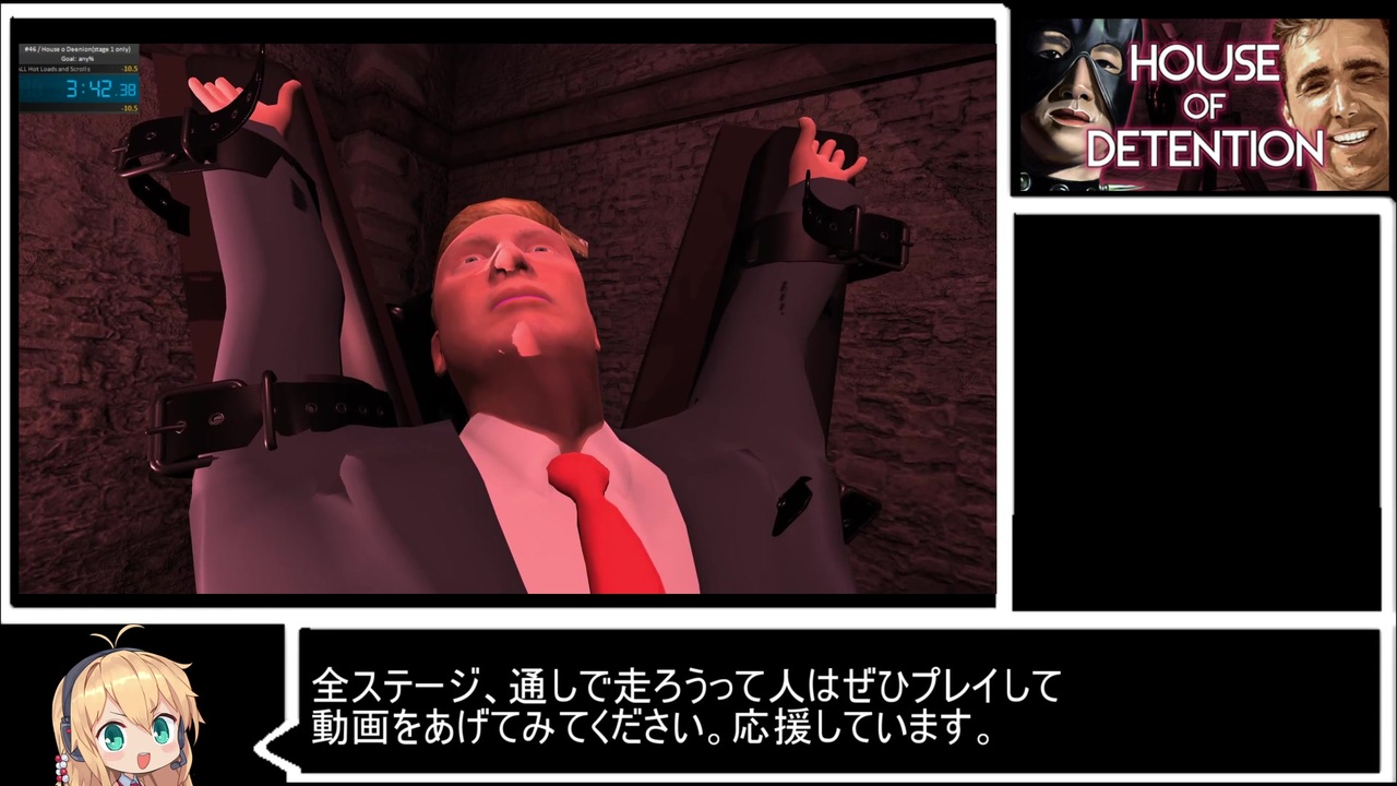 <strong>・走ることに意義があるって、それ一番言われてるから<br>・はじめてのRTAでしたが楽しめてよかったと思います<br>・値段に惑わされないで、クソゲーではないと思うわ</strong><br> <br>House of Detentionとは拘置所、留置場を指すようです。<br>ガチムチに自信兄貴たちが絶対すぐ走ると思ったのにいつまでたっても走らないから、ガチムチよく知らない勢の私が走ることと相成りました。<br>さっさと無慈悲して<br> →次回のRTA(TNT! - An Explosive First Person Shooter):<a href="https://www.nicovideo.jp/watch/sm37053680" class="watch">sm37053680</a><br><br><レギュレーション><br>・Presidentsモード<br>・無料パッチ適用済み<br>・ステージ1(日本語名:刑務所)のみ<br>・計測開始・終了地点は動画参照<br> <br>RTAは <a href="#" class="seekTime" data-seekTime="10:26" onclick="seekNicoPlayer('#10:26'); return false;">#10:26</a> から<br><br><strong>*追記:2020/6/11*</strong><br>steamストアページ貼るの忘れてていかん危ない危ない危ない…<br><a href="https://store.steampowered.com/app/1293230/House_of_Detention/" target="_blank" rel="noopener nofollow">https://store.steampowered.com/app/1293230/House_of_Detention/</a><br>幸いにもまだ消されてないみたいなので皆もワンコイン(100円)で購入して大統領と握手!<br>18歳以上はガチムチ兄貴とかモンスター娘とも鬼ごっこしたり<br>マルチプレイ、DLCと盛りだくさんの無料パッチもDL可なのでしゃぶり尽くしてどうぞ<br><br><strong>*追記2:2020/6/14*</strong><br>本日がプレゼントの当選日ですね!外野から楽しみにしてます<br>え私?つべのアカウント持ってないんで…<br>それはそれとして、駄菓子ゲー、奇ゲー、その他おススメゲーの情報ありましたら下記ついったまで気軽にご一報ください、自分も紹介してますしたまに返事もします<br><a href="https://twitter.com/momen_unosuke88" target="_blank" rel="noopener nofollow">https://twitter.com/momen_unosuke88</a>