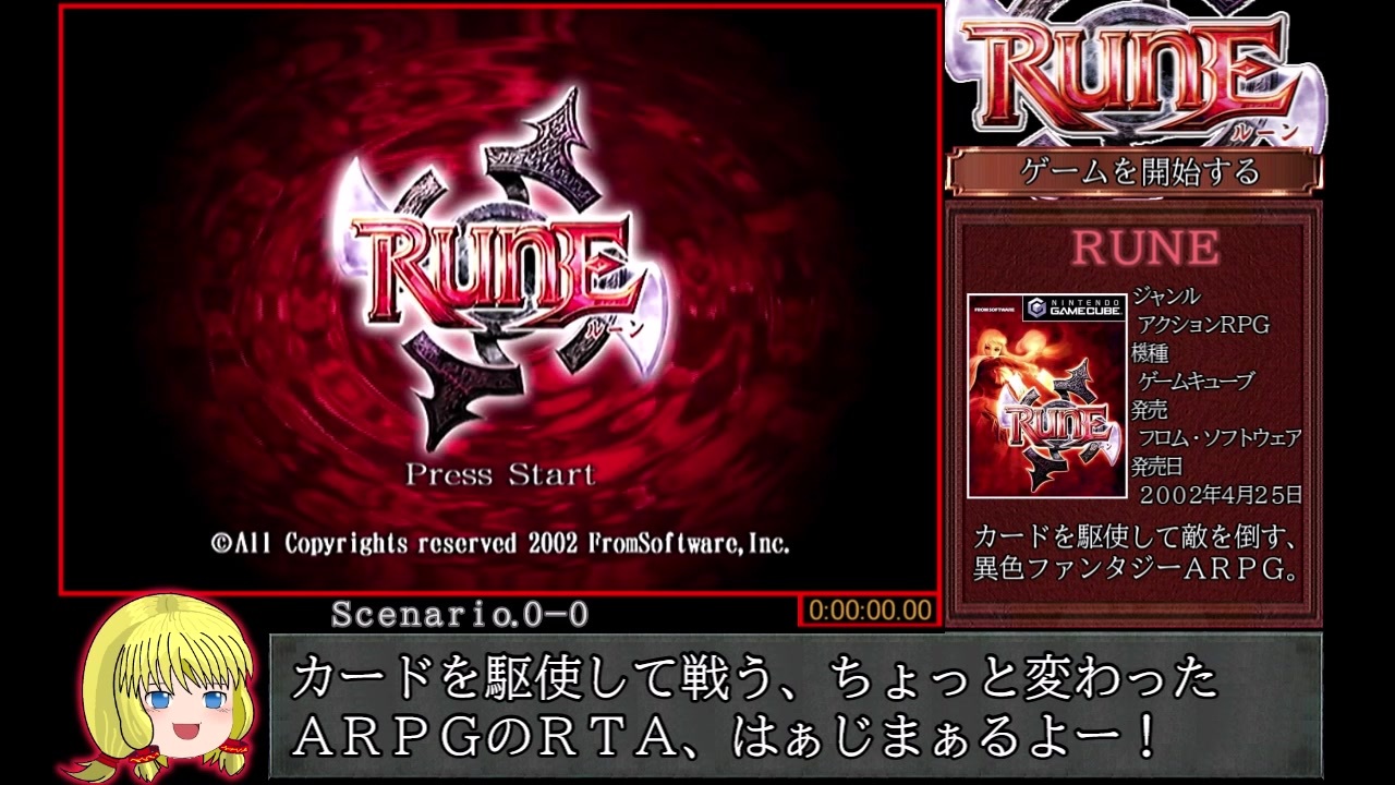 初投稿です。フロム・ソフトウェアがお送りする期待の新作<span style="color: #4d5156; font-size: 14px;">『</span><span style="color: #5f6368; font-size: 14px;"><strong>Project Rune</strong></span><span style="color: #4d5156; font-size: 14px;">』その原点のゲーム、</span><br><span style="color: #4d5156;">『RUNE(ルーン)』のRTAです。と、言いたいんですが、どうやら名前が同じだけで全く関係ないみたいです。まあ世界観はいつもの中世っぽい感じなので大体同じです。多分。<br><br>本作のRTAを検索してもシンプルな名前故か、某ファクトリーばかりしかヒットしなかったので、レギュレーションは自分で決め、チャートも自作しました。<br><br>レギュレーションは、バグ技などは使わず(というか知らない)ゲーム開始からクリアデータのセーブが完了するまでを計測します。<br><br>プレイ環境は、普通のゲームキューブとコントローラーで、普通の実機プレイです。<br><br>追記:宣伝ありがとうございました。次回作は未定ですが、とりあえず3デブマラソンでも走ってみます。あとデモンズのリメイクが決まったので解説動画でもたまに作成してみようかなと思ってます。</span><br><br>次<a href="https://www.nicovideo.jp/watch/sm37004374" class="watch">sm37004374</a> <a href="https://www.nicovideo.jp/mylist/55290772" target="_blank" rel="noopener">mylist/55290772</a><br><br><br><br>