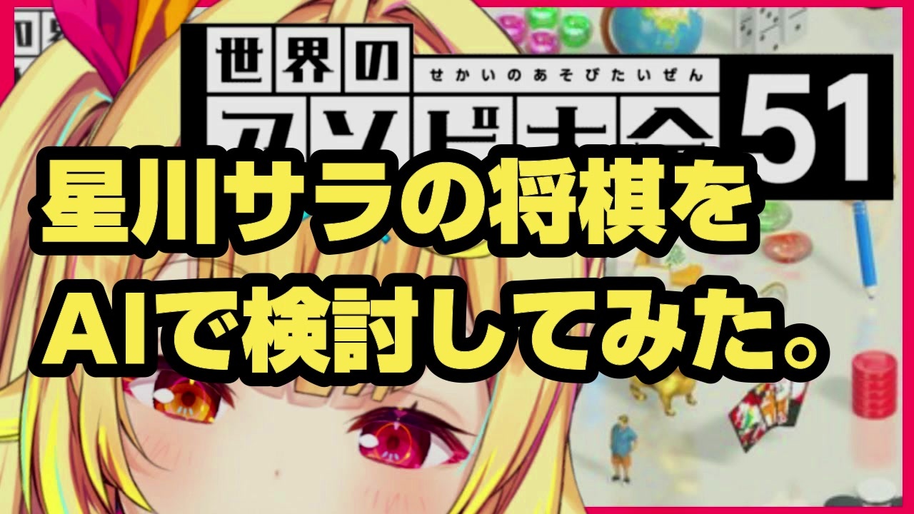 星川サラちゃんが指した将棋の棋譜を、将棋AI(水匠2:<span style="color: #000000; font-size: 14px;">世界コンピュータ将棋オンライン大会2020優勝</span>)で検討してみました。 <strong>追記。意外と多くの方に見ていただけていて、好評で驚きです。ありがとうございます。</strong><br><br>■星川サラちゃんはどうすれば勝てたのか?解説しました。<strong>【将棋解説】星川サラは、あと数手で必勝だった。【最強AIで検討】本編7分+おまけ </strong><a href="https://www.nicovideo.jp/watch/sm37020645" class="watch">sm37020645</a><br><br>■後半の企画を反省して、<strong>【将棋対局】星川が負けた所から最強AIにガチ対局させた【棋譜鑑賞】</strong>を公開しました。 <a href="https://www.nicovideo.jp/watch/sm37027018" class="watch">sm37027018</a> <br><br>将棋AI(コンピュータ将棋)利用させていただきました。ありがとうございます。<br><br>●「水匠2」:コンピュータ将棋(第29回世界コンピュータ将棋選手権決勝リーグ進出、全体7位「水匠」、世界コンピュータ将棋オンライン大会2020優勝「水匠2」、NNUEkai)( @tayayan_ts )<br><br>●「やねうら王」:電王トーナメント5年連続受賞 / CODEVS5.0準優勝 / 探索部やねうら王 WCSC27 elmo優勝・SDT5 ぽんぽこ優勝・WCSC28 白ビール優勝 ・ WCSC29 やねうら王優勝 ( @yaneuraou )<br><br><span style="color: #ff0000;"><strong>ニコニ広告ありがとうございます!</strong></span><br>gunknown さん、プレミスト さん、ほしくず さん、アルヴァ さん、eye in the fky さん、kisara さん、ダディ橘 さん、yayaura さん、よしお さん、万年ROM さん<br><br><br>#星川サラ #星川観測 #将棋 #世界のアソビ大全51<br><br>星川サラちゃんの動画<br>【アソビ大全】51種類のゲーム!初めて遊ぶど~!!【星川サラ/にじさんじ】<br><a href="https://youtu.be/R19qWS48vGI" target="_blank" rel="noopener nofollow">https://youtu.be/R19qWS48vGI</a>