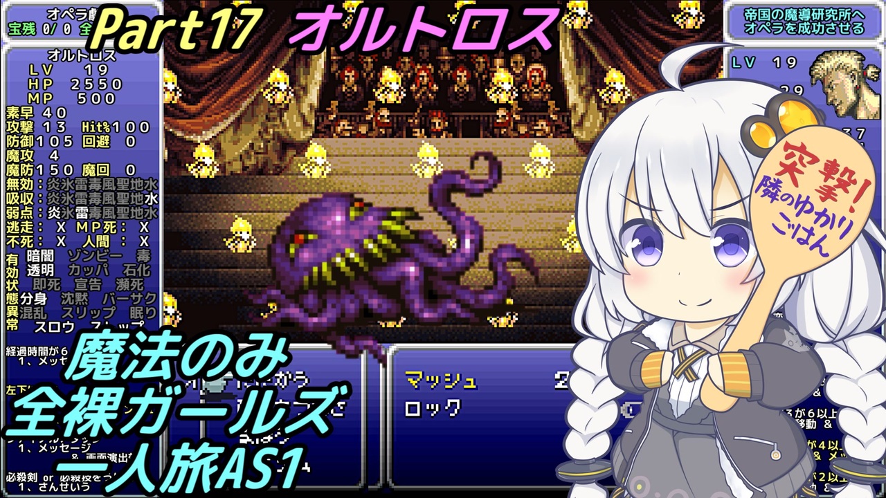ヨシ!<br><br>・次回 … Part18 <a href="https://www.nicovideo.jp/watch/sm37109065" class="watch">sm37109065</a><br>・前回 … Part16 <a href="https://www.nicovideo.jp/watch/sm36949482" class="watch">sm36949482</a><br><br>・Youtube版 … <a href="https://youtu.be/qGylnwIeFDI" target="_blank" rel="noopener nofollow">https://youtu.be/qGylnwIeFDI</a><br>・字幕のみ … <a href="https://youtu.be/eB1lhrnH-_0" target="_blank" rel="noopener nofollow">https://youtu.be/eB1lhrnH-_0</a><br><br>【縛り内容】<br>1、魔法のみ<br>2、全裸(魔石はあり)<br>3、ガールズ<br>4、一人旅<br>5、アクティブ バトルスピード1 メッセージスピード1 詳細:<a href="https://www.nicovideo.jp/watch/sm34595412" class="watch">sm34595412</a><br>6、逃げられない!!表示の連射禁止<br>7、ボスの即死は禁止<br>8、宝物は全て集める<br>9、不具合やバグは不可<br>10、可能な限り低レベル<br>11、コマンド短縮やカーソル記憶しない<br>12、セーブ可能な場所でのみアイテム可<br>13、一部ストーリー上の編成でやむを得ない場合は最低限<br /><br>ふよふよしているの<br>絵:横沢さわらさん VOICEVOX:WhiteCUL<br><br>【シリーズ】<br>くうねるきゃんぷ … <a href="https://www.nicovideo.jp/series/516069" target="_blank" rel="noopener">series/516069</a><br>お写んぽ! … <a href="https://www.nicovideo.jp/series/435756" target="_blank" rel="noopener">series/435756</a><br>様子がおかしい! … <a href="https://www.nicovideo.jp/series/418875" target="_blank" rel="noopener">series/418875</a><br>FF7 魔法マテリアのみ初期防具ガールズ一人旅ASM … <a href="https://www.nicovideo.jp/series/438696" target="_blank" rel="noopener">series/438696</a><br>きんかつ!V-STROM1050XT … <a href="https://www.nicovideo.jp/series/144466" target="_blank" rel="noopener">series/144466</a><br>FF6 魔法のみ全裸ガールズ一人旅AS1 … <a href="https://www.nicovideo.jp/series/9438" target="_blank" rel="noopener">series/9438</a><br>おバイク!GLADIUS400 ABS … <a href="https://www.nicovideo.jp/series/68579" target="_blank" rel="noopener">series/68579</a><br>FF5 魔法のみ全裸一人旅AS1 … <a href="https://www.nicovideo.jp/series/9432" target="_blank" rel="noopener">series/9432</a><br>DQ3 呪文のみ全裸一人旅 … <a href="https://www.nicovideo.jp/series/9416" target="_blank" rel="noopener">series/9416</a><br>DQ2 ムーンブルクの王女一人旅 … <a href="https://www.nicovideo.jp/series/9414" target="_blank" rel="noopener">series/9414</a><br>DQ1 全裸 … <a href="https://www.nicovideo.jp/series/9412" target="_blank" rel="noopener">series/9412</a><br>FE 紋章の謎 天馬騎士単騎 第2部 英雄戦争 … <a href="https://www.nicovideo.jp/series/9404" target="_blank" rel="noopener">series/9404</a><br>FE 紋章の謎 天馬騎士単騎 第1部 暗黒戦争 … <a href="https://www.nicovideo.jp/series/9401" target="_blank" rel="noopener">series/9401</a><br>聖剣2 全裸プリム一人旅 武器Lv1など … <a href="https://www.nicovideo.jp/series/9396" target="_blank" rel="noopener">series/9396</a><br>ロマサガ2 魔術士不得意武器のみ … <a href="https://www.nicovideo.jp/series/9388" target="_blank" rel="noopener">series/9388</a><br>ロマサガ1 術法のみ一人旅で各イベント攻略 … <a href="https://www.nicovideo.jp/series/9386" target="_blank" rel="noopener">series/9386</a><br><br>SNSとか色々なリンク … <a href="https://lit.link/Unaa" target="_blank" rel="noopener nofollow">https://lit.link/Unaa</a>