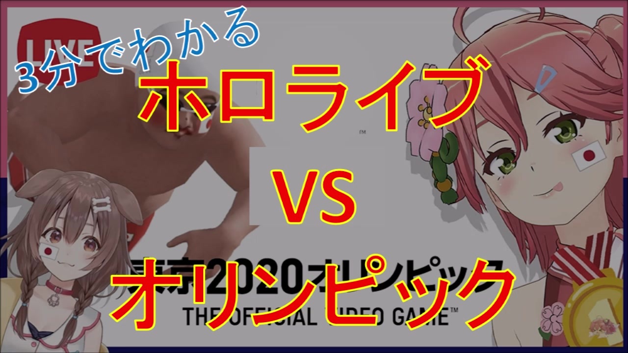 ホロライブとオリンピックについてのまとめ動画です。<br>ニコニコ動画で大会ロゴを使用してよいかわからなかったため、動画内のロゴは全て塗りつぶしています。ご了承ください。<br><br>・引用動画<br>戌神ころね <a href="https://youtu.be/5tVNgvVZszg" target="_blank" rel="noopener nofollow">https://youtu.be/5tVNgvVZszg</a><br>さくらみこ <a href="https://youtu.be/0T-0GMpmlPg" target="_blank" rel="noopener nofollow">https://youtu.be/0T-0GMpmlPg</a><br>紫咲シオン <a href="https://youtu.be/JEk8BJXadas" target="_blank" rel="noopener nofollow">https://youtu.be/JEk8BJXadas</a><br>兎田ぺこら <a href="https://youtu.be/P6HjgQu2OEE" target="_blank" rel="noopener nofollow">https://youtu.be/P6HjgQu2OEE</a><br><br>・引用サイト<br>弊社における無許諾配信の不手際のお詫びと今後の対応につきまして <a href="https://cover-corp.com/2020/06/05/弊社における権利確認不手際のお詫びと今後の対/" target="_blank" rel="noopener nofollow">https://cover-corp.com/2020/06/05/弊社における権利確認不手際のお詫びと今後の対/</a><br>知的財産の保護 <a href="https://tokyo2020.org/ja/utilities/copyright" target="_blank" rel="noopener nofollow">https://tokyo2020.org/ja/utilities/copyright</a><br>大会ブランド保護基準(リンク先PDF) <a href="https://gtimg.tokyo2020.org/image/upload/production/ujqwxe8cojnsrmewsbfa.pdf" target="_blank" rel="noopener nofollow">https://gtimg.tokyo2020.org/image/upload/production/ujqwxe8cojnsrmewsbfa.pdf</a><br>権利表記 <a href="https://manual.sega.jp/olympicvideogames/?pid=39" target="_blank" rel="noopener nofollow">https://manual.sega.jp/olympicvideogames/?pid=39</a><br>セガQ&Aサイト <a href="https://faq.sega.jp/hc/ja/sections/360004932514-東京2020オリンピック-The-Official-Video-Game" target="_blank" rel="noopener nofollow">https://faq.sega.jp/hc/ja/sections/360004932514-東京2020オリンピック-The-Official-Video-Game</a><br>___________________________________<br>※追記<br>6月18日に該当動画群が非公開にされました。<br>サムネが見れない人用の画像リンク→<a href="https://imgur.com/1uGW0Co" target="_blank" rel="noopener nofollow">https://imgur.com/1uGW0Co</a>