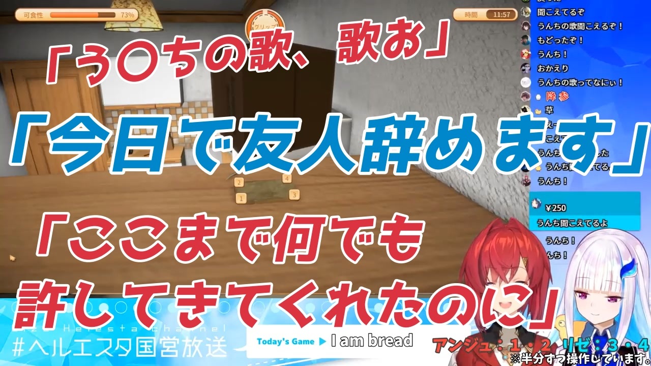 う〇ち!!!<br><br><高画質版><br><a href="https://youtu.be/Lu5opd8o43w" target="_blank" rel="noopener nofollow">https://youtu.be/Lu5opd8o43w</a><br><br><span style="color: rgba(0, 0, 0, 0.87); font-size: 15px;"><元動画><br>【I am Bread】2人で一枚のパンを操作して立派なトーストになる【にじさんじ/#リゼアン】<br><a href="https://www.youtube.com/watch?v=34YU0PmJaO8&t=3060s" target="_blank" rel="noopener nofollow">https://www.youtube.com/watch?v=34YU0PmJaO8&t=3060s</a><br><br><チャンネル><br>アンジュ・カトリーナ<br><a href="https://www.youtube.com/channel/UCHVXbQzkl3rDfsXWo8xi2qw" target="_blank" rel="noopener nofollow">https://www.youtube.com/channel/UCHVXbQzkl3rDfsXWo8xi2qw</a><br><br>リゼ・ヘルエスタ<br><a href="https://www.youtube.com/channel/UCZ1xuCK1kNmn5RzPYIZop3w" target="_blank" rel="noopener nofollow">https://www.youtube.com/channel/UCZ1xuCK1kNmn5RzPYIZop3w</a></span>