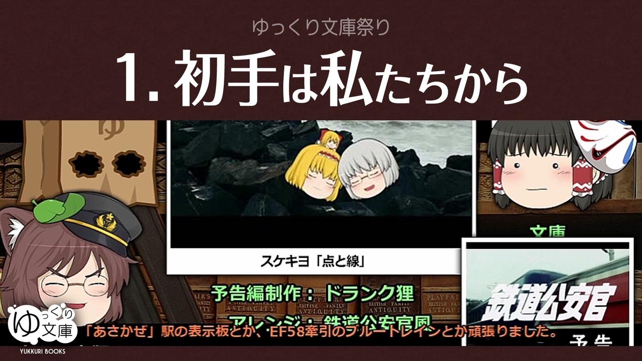 <span style="color: red;"><strong>090x1 まずは1回目──</strong></span><br>ストックされた予告編は30本くらい。10分ずつくらいに分けて毎週投稿しよう。紹介された動画は、視聴済みでもまた見てほしい。<br><br>●連鎖<br>2020/06/20 - ピンクの悪魔に替え歌コメントが付く。<br>2020/11/12 - 新たな替え歌が投稿される。<br>虎顎(コガク)「ミス・マープル」シリーズ応援替え歌歌詞カード<br><a href="https://www.pixiv.net/artworks/85623679" target="_blank" rel="noopener nofollow">https://www.pixiv.net/artworks/85623679</a><br><br>●ゆっくり文庫祭り<br><a href="https://www.nicovideo.jp/watch/sm37057377" class="watch">sm37057377</a> ウソ予告:予告<br><a href="https://www.nicovideo.jp/watch/sm37057819" class="watch">sm37057819</a> まとめ1:初手は私たちから★<br><a href="https://www.nicovideo.jp/watch/sm37107566" class="watch">sm37107566</a> まとめ2:祭りの主旨は<br><a href="https://www.nicovideo.jp/watch/sm37137887" class="watch">sm37137887</a> まとめ3:かぶりウェルカム<br><a href="https://www.nicovideo.jp/watch/sm37180688" class="watch">sm37180688</a> まとめ4:文庫スペシャル<br><a href="https://www.nicovideo.jp/watch/sm37232413" class="watch">sm37232413</a> まとめ5:生声サンプルあり<br><a href="https://www.nicovideo.jp/watch/sm37552205" class="watch">sm37552205</a> まとめ6:伝え合う<br><a href="https://www.nicovideo.jp/watch/sm37598563" class="watch">sm37598563</a> まとめ7:ある投稿者の物語<br><a href="https://www.nicovideo.jp/watch/sm37246611" class="watch">sm37246611</a> ファンアートまとめ<br><br>●紹介された動画<br><a href="#" class="seekTime" data-seekTime="00:40" onclick="seekNicoPlayer('#00:40'); return false;">#00:40</a> <a href="https://www.nicovideo.jp/watch/sm36728298" class="watch">sm36728298</a> みきと「帰ってきたソフィ・メイスン」<br><a href="#" class="seekTime" data-seekTime="01:37" onclick="seekNicoPlayer('#01:37'); return false;">#01:37</a> <a href="https://www.nicovideo.jp/watch/sm24238713" class="watch">sm24238713</a> ゆっくり文庫「完璧なメイド」<br><a href="#" class="seekTime" data-seekTime="02:24" onclick="seekNicoPlayer('#02:24'); return false;">#02:24</a> <a href="https://www.nicovideo.jp/watch/sm35754334" class="watch">sm35754334</a> ヤタ「クリスマスキャロル」<br><a href="#" class="seekTime" data-seekTime="03:08" onclick="seekNicoPlayer('#03:08'); return false;">#03:08</a> <a href="https://www.nicovideo.jp/watch/sm35039558" class="watch">sm35039558</a> 筋之助「三枚のお札」<br><a href="#" class="seekTime" data-seekTime="03:49" onclick="seekNicoPlayer('#03:49'); return false;">#03:49</a> <a href="https://www.nicovideo.jp/watch/sm35400849" class="watch">sm35400849</a> スケキヨ「車井戸はなぜ軋る」<br><a href="#" class="seekTime" data-seekTime="05:35" onclick="seekNicoPlayer('#05:35'); return false;">#05:35</a> <a href="https://www.nicovideo.jp/watch/sm25512772" class="watch">sm25512772</a> ゆっくり文庫「動機と機会」<br><a href="#" class="seekTime" data-seekTime="06:34" onclick="seekNicoPlayer('#06:34'); return false;">#06:34</a> <a href="https://www.nicovideo.jp/watch/sm35087210" class="watch">sm35087210</a> rironya「Yes, Virginia, There is a Santa Claus」<br><a href="#" class="seekTime" data-seekTime="09:55" onclick="seekNicoPlayer('#09:55'); return false;">#09:55</a> <a href="https://www.nicovideo.jp/watch/sm34958112" class="watch">sm34958112</a> スケキヨ 「点と線」<br><br>●ゆっくり文庫について<br>全部:<a href="https://www.nicovideo.jp/mylist/74874627" target="_blank" rel="noopener">mylist/74874627</a><br>近況:<a href="https://twitter.com/trynext" target="_blank" rel="noopener nofollow">https://twitter.com/trynext</a><br><br>