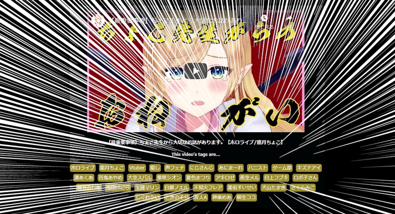 2020年6月20日放送<br>【最重要事項】ちょこ先生から大切なお話があります。【ホロライブ/癒月ちょこ】<br>元配信:<a href="https://www.youtube.com/watch?v=EoI54HWYBy4" target="_blank" rel="noopener nofollow">https://www.youtube.com/watch?v=EoI54HWYBy4</a><br><br>赤井はあとVer:<a href="https://www.nicovideo.jp/watch/sm37068349" class="watch">sm37068349</a><br>黒人をチョコボールに例える白上フブキ:<a href="https://www.nicovideo.jp/watch/sm37076430" class="watch">sm37076430</a>