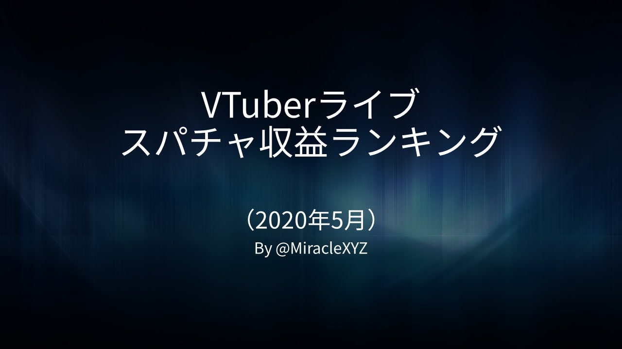 ニコニコの皆さん、こんにちは。MiracleXYZです。<br>Hello, Niconico! I'm MiracleXYZ.<br><br>このビデオは、2020年5月のVTuberスパチャランキングに関するものです。<br>This video is about VTuber SuperChat Ranking in May 2020.<br><br>————<br>データソース:<br>- スパチャ:自作データベース<br>- アーカイブ削除修正:Playboard ( <a href="https://playboard.co/" target="_blank" rel="noopener nofollow">https://playboard.co/</a> )<br>- VTuber基本情報:VNUMA ( <a href="https://hiyoko.sonoj.net/" target="_blank" rel="noopener nofollow">https://hiyoko.sonoj.net/</a> )<br>Template: <a href="https://github.com/LePtC/AutoAni" target="_blank" rel="noopener nofollow">https://github.com/LePtC/AutoAni</a><br>Music: Distrion & Electro-Light - Rubik [NCS Release] ( <a href="https://youtu.be/A2AydJcUKR8" target="_blank" rel="noopener nofollow">https://youtu.be/A2AydJcUKR8</a> )<br>Free Download / Stream: <a href="http://ncs.io/rubik" target="_blank" rel="noopener nofollow">http://ncs.io/rubik</a>