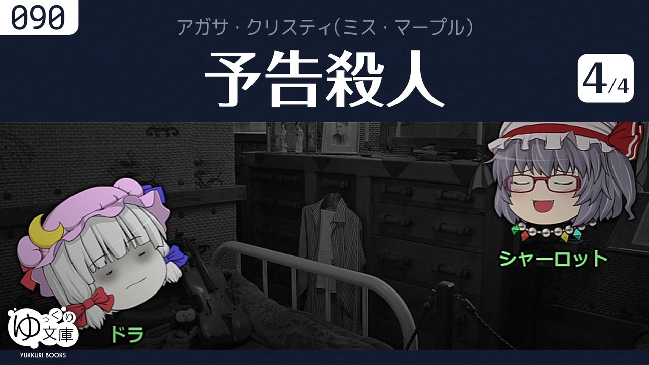 <span style="color: red;"><strong>090d やさしい殺人者──</strong></span><br>犯人は自供した。手口も動機も明らかになった。あとは関係者に事実を伝えるだけ。彼らはレティシア・ブラックロックの姿が見えない理由を知らない。<br>※【ゆっくり文庫】は二次創作です。<br><br>●ゆっクリスティ <a href="https://www.nicovideo.jp/mylist/59497715" target="_blank" rel="noopener">mylist/59497715</a><br>◆ミス・マープル<br><a href="https://www.nicovideo.jp/watch/sm24238713" class="watch">sm24238713</a> 完璧なメイド<br><a href="https://www.nicovideo.jp/watch/sm25512772" class="watch">sm25512772</a> 動機と機会<br><a href="https://www.nicovideo.jp/watch/sm26942176" class="watch">sm26942176</a> 青いゼラニウム<br><a href="https://www.nicovideo.jp/watch/sm30507320" class="watch">sm30507320</a> ポケットにライ麦を (全3話)<br><a href="https://www.nicovideo.jp/watch/sm32946182" class="watch">sm32946182</a> パディントン発4時50分(On Going)<br><a href="https://www.nicovideo.jp/watch/sm38609548" class="watch">sm38609548</a> # 原作に近い版<br><a href="https://www.nicovideo.jp/watch/sm33091342" class="watch">sm33091342</a> 鏡は横にひび割れて<br><a href="https://www.nicovideo.jp/watch/sm37048244" class="watch">sm37048244</a> 予告殺人 #1 殺人のお知らせ<br><a href="https://www.nicovideo.jp/watch/sm37064125" class="watch">sm37064125</a> #2 ゲドラーの遺産<br><a href="https://www.nicovideo.jp/watch/sm37075231" class="watch">sm37075231</a> #3 甘美なる死<br><a href="https://www.nicovideo.jp/watch/sm37088256" class="watch">sm37088256</a> <span style="color: #ff00ff;"><strong>#4 やさしい殺人者</strong></span><br><a href="https://www.nicovideo.jp/watch/sm37202036" class="watch">sm37202036</a> #z ドラ・バンナーは間違っていたか?<br><br>◆ポワロ<br><a href="https://www.nicovideo.jp/watch/sm25458371" class="watch">sm25458371</a> スズメバチの巣<br><a href="https://www.nicovideo.jp/watch/sm38918082" class="watch">sm38918082</a> オリエント急行の殺人(On Going)<br><a href="https://www.nicovideo.jp/watch/sm39365170" class="watch">sm39365170</a> ナイルに死す (全3話)<br><a href="https://www.nicovideo.jp/watch/sm40164143" class="watch">sm40164143</a> 消えた遺言書<br><br>◆ほか<br><a href="https://www.nicovideo.jp/watch/sm33975066" class="watch">sm33975066</a> そして誰もいなくなった (全2話)<br><a href="https://www.nicovideo.jp/watch/sm33986818" class="watch">sm33986818</a> #PV 松谷祐子「愛はブーメラン」<br><br>●ゆっくり文庫について<br>全部:<a href="https://www.nicovideo.jp/mylist/74874627" target="_blank" rel="noopener">mylist/74874627</a><br>近況:<a href="https://twitter.com/trynext" target="_blank" rel="noopener nofollow">https://twitter.com/trynext</a><br><br>