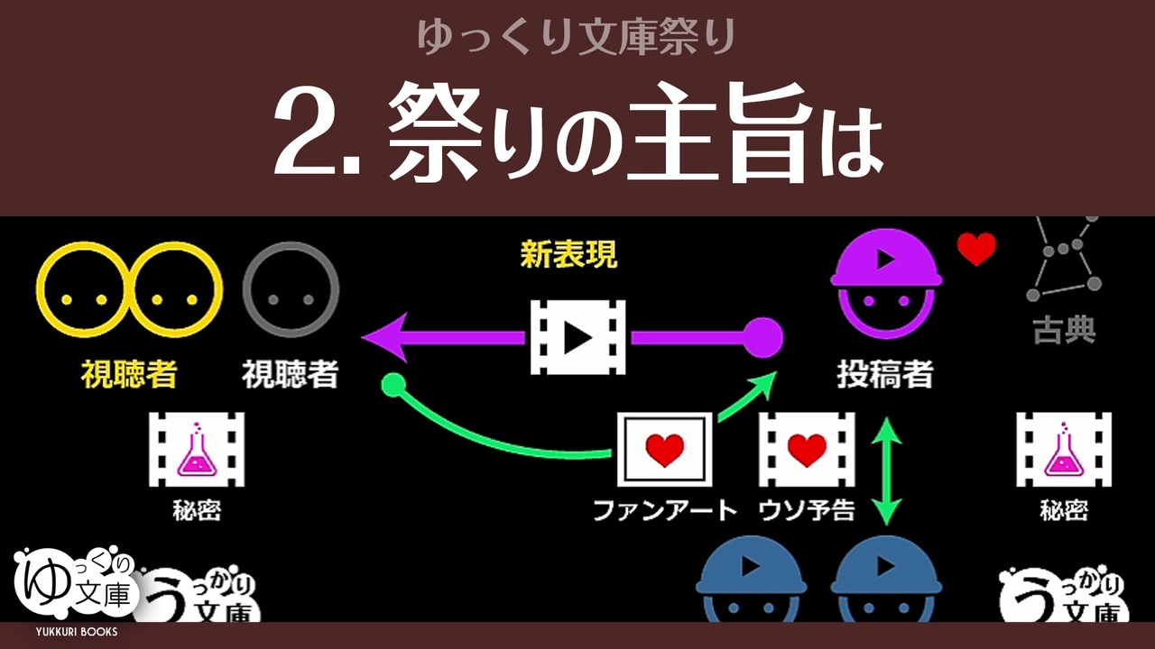 <span style="color: red;"><strong>090x2 祭りの主旨をもう一度──</strong></span><br><br>●ゆっくり文庫祭り<br><a href="https://www.nicovideo.jp/watch/sm37057377" class="watch">sm37057377</a> ウソ予告:予告<br><a href="https://www.nicovideo.jp/watch/sm37057819" class="watch">sm37057819</a> まとめ1:初手は私たちから<br><a href="https://www.nicovideo.jp/watch/sm37107566" class="watch">sm37107566</a> まとめ2:祭りの主旨は★<br><a href="https://www.nicovideo.jp/watch/sm37137887" class="watch">sm37137887</a> まとめ3:かぶりウェルカム<br><a href="https://www.nicovideo.jp/watch/sm37180688" class="watch">sm37180688</a> まとめ4:文庫スペシャル<br><a href="https://www.nicovideo.jp/watch/sm37232413" class="watch">sm37232413</a> まとめ5:生声サンプルあり<br><a href="https://www.nicovideo.jp/watch/sm37552205" class="watch">sm37552205</a> まとめ6:伝え合う<br><a href="https://www.nicovideo.jp/watch/sm37598563" class="watch">sm37598563</a> まとめ7:ある投稿者の物語<br><a href="https://www.nicovideo.jp/watch/sm37246611" class="watch">sm37246611</a> ファンアートまとめ<br><br>●紹介された動画 <a href="#" class="seekTime" data-seekTime="02:55" onclick="seekNicoPlayer('#02:55'); return false;">#02:55</a> から<br><a href="#" class="seekTime" data-seekTime="03:17" onclick="seekNicoPlayer('#03:17'); return false;">#03:17</a> <a href="https://www.nicovideo.jp/watch/sm35260714" class="watch">sm35260714</a> 里場「悪魔」<br><a href="#" class="seekTime" data-seekTime="04:13" onclick="seekNicoPlayer('#04:13'); return false;">#04:13</a> <a href="https://www.nicovideo.jp/watch/sm36674401" class="watch">sm36674401</a> ドランク狸「万華鏡」<br><a href="#" class="seekTime" data-seekTime="05:01" onclick="seekNicoPlayer('#05:01'); return false;">#05:01</a> <a href="https://www.nicovideo.jp/watch/sm35785342" class="watch">sm35785342</a> 筋之助「鮒女房」<br><a href="#" class="seekTime" data-seekTime="06:29" onclick="seekNicoPlayer('#06:29'); return false;">#06:29</a> <a href="https://www.nicovideo.jp/watch/sm29541333" class="watch">sm29541333</a> 文庫「キリマンジャロの雪」<br><a href="#" class="seekTime" data-seekTime="07:18" onclick="seekNicoPlayer('#07:18'); return false;">#07:18</a> <a href="https://www.nicovideo.jp/watch/sm35536657" class="watch">sm35536657</a> めれんげ「きのこ会議」<br><a href="#" class="seekTime" data-seekTime="08:00" onclick="seekNicoPlayer('#08:00'); return false;">#08:00</a> <a href="https://www.nicovideo.jp/watch/sm31456235" class="watch">sm31456235</a> 文庫「緋色の研究」<br><a href="#" class="seekTime" data-seekTime="08:56" onclick="seekNicoPlayer('#08:56'); return false;">#08:56</a> <a href="https://www.nicovideo.jp/watch/sm35240023" class="watch">sm35240023</a> スケキヨ「悪魔が来りて笛を吹く」<br><a href="#" class="seekTime" data-seekTime="11:21" onclick="seekNicoPlayer('#11:21'); return false;">#11:21</a> <a href="https://www.nicovideo.jp/watch/sm36175959" class="watch">sm36175959</a> 紙箱「華麗なるギャツビー」<br><a href="#" class="seekTime" data-seekTime="12:37" onclick="seekNicoPlayer('#12:37'); return false;">#12:37</a> <a href="https://www.nicovideo.jp/watch/sm35847501" class="watch">sm35847501</a> rironya「最初の客とフィレンツェ版ダンテ」<br><a href="https://www.nicovideo.jp/watch/sm36165042" class="watch">sm36165042</a> にゅんひ「鮒女房 超妄想版」<br><a href="https://www.nicovideo.jp/watch/sm37072319" class="watch">sm37072319</a> rironya「四つの署名/百鬼園先生雑記帳/他」<br><br>●ゆっくり文庫<br><a href="https://www.nicovideo.jp/mylist/39107052" target="_blank" rel="noopener">mylist/39107052</a> [001-]<br><a href="https://www.nicovideo.jp/mylist/63625257" target="_blank" rel="noopener">mylist/63625257</a> [060-]<br><a href="https://www.nicovideo.jp/mylist/71854227" target="_blank" rel="noopener">mylist/71854227</a> [101-]<br>近況:<a href="https://twitter.com/trynext" target="_blank" rel="noopener nofollow">https://twitter.com/trynext</a><br><br>