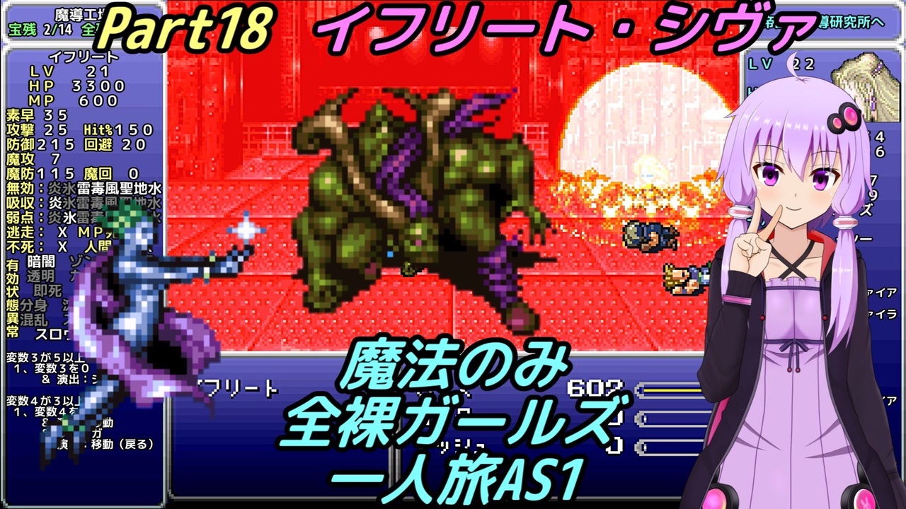 出涸らし幻獣<br><br>・次回 … Part19 <a href="https://www.nicovideo.jp/watch/sm37211416" class="watch">sm37211416</a><br>・前回 … Part17 <a href="https://www.nicovideo.jp/watch/sm37038311" class="watch">sm37038311</a><br><br>・Youtube版 … <a href="https://youtu.be/As01LXL4ZT0" target="_blank" rel="noopener nofollow">https://youtu.be/As01LXL4ZT0</a><br>・字幕のみ … <a href="https://youtu.be/j-IMLpLDQYU" target="_blank" rel="noopener nofollow">https://youtu.be/j-IMLpLDQYU</a><br><br>【縛り内容】<br>1、魔法のみ<br>2、全裸(魔石はあり)<br>3、ガールズ<br>4、一人旅<br>5、アクティブ バトルスピード1 メッセージスピード1 詳細:<a href="https://www.nicovideo.jp/watch/sm34595412" class="watch">sm34595412</a><br>6、逃げられない!!表示の連射禁止<br>7、ボスの即死は禁止<br>8、宝物は全て集める<br>9、不具合やバグは不可<br>10、可能な限り低レベル<br>11、コマンド短縮やカーソル記憶しない<br>12、セーブ可能な場所でのみアイテム可<br>13、一部ストーリー上の編成でやむを得ない場合は最低限<br /><br>ふよふよしているの<br>絵:横沢さわらさん VOICEVOX:WhiteCUL<br><br>【シリーズ】<br>くうねるきゃんぷ … <a href="https://www.nicovideo.jp/series/516069" target="_blank" rel="noopener">series/516069</a><br>お写んぽ! … <a href="https://www.nicovideo.jp/series/435756" target="_blank" rel="noopener">series/435756</a><br>様子がおかしい! … <a href="https://www.nicovideo.jp/series/418875" target="_blank" rel="noopener">series/418875</a><br>FF7 魔法マテリアのみ初期防具ガールズ一人旅ASM … <a href="https://www.nicovideo.jp/series/438696" target="_blank" rel="noopener">series/438696</a><br>きんかつ!V-STROM1050XT … <a href="https://www.nicovideo.jp/series/144466" target="_blank" rel="noopener">series/144466</a><br>FF6 魔法のみ全裸ガールズ一人旅AS1 … <a href="https://www.nicovideo.jp/series/9438" target="_blank" rel="noopener">series/9438</a><br>おバイク!GLADIUS400 ABS … <a href="https://www.nicovideo.jp/series/68579" target="_blank" rel="noopener">series/68579</a><br>FF5 魔法のみ全裸一人旅AS1 … <a href="https://www.nicovideo.jp/series/9432" target="_blank" rel="noopener">series/9432</a><br>DQ3 呪文のみ全裸一人旅 … <a href="https://www.nicovideo.jp/series/9416" target="_blank" rel="noopener">series/9416</a><br>DQ2 ムーンブルクの王女一人旅 … <a href="https://www.nicovideo.jp/series/9414" target="_blank" rel="noopener">series/9414</a><br>DQ1 全裸 … <a href="https://www.nicovideo.jp/series/9412" target="_blank" rel="noopener">series/9412</a><br>FE 紋章の謎 天馬騎士単騎 第2部 英雄戦争 … <a href="https://www.nicovideo.jp/series/9404" target="_blank" rel="noopener">series/9404</a><br>FE 紋章の謎 天馬騎士単騎 第1部 暗黒戦争 … <a href="https://www.nicovideo.jp/series/9401" target="_blank" rel="noopener">series/9401</a><br>聖剣2 全裸プリム一人旅 武器Lv1など … <a href="https://www.nicovideo.jp/series/9396" target="_blank" rel="noopener">series/9396</a><br>ロマサガ2 魔術士不得意武器のみ … <a href="https://www.nicovideo.jp/series/9388" target="_blank" rel="noopener">series/9388</a><br>ロマサガ1 術法のみ一人旅で各イベント攻略 … <a href="https://www.nicovideo.jp/series/9386" target="_blank" rel="noopener">series/9386</a><br><br>SNSとか色々なリンク … <a href="https://lit.link/Unaa" target="_blank" rel="noopener nofollow">https://lit.link/Unaa</a>