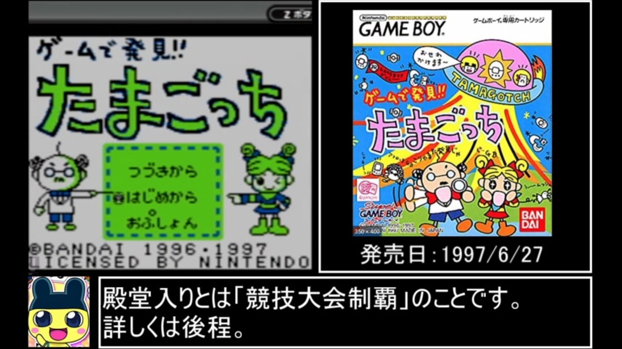 通し一回目です。改善点だらけですが、運ゲー過ぎるので再走はしません。<br>※途中の運動ゲーム、すごく難しいみたいに言ってますが実際は簡単だそうです。僕がクソザコだったのは遅延によるセルフ難易度アップか、もしくは単に下手くそなだけか、DDYDD<br><br>おまけ(隠したまごっちへの道)→<a href="https://www.nicovideo.jp/watch/sm37116408" class="watch">sm37116408</a><br><br>汚い要素無しver→<a href="https://youtu.be/rG0btFCb_VA" target="_blank" rel="noopener nofollow">https://youtu.be/rG0btFCb_VA</a><br>無編集ver→<a href="https://youtu.be/h9IzgPMmoLI" target="_blank" rel="noopener nofollow">https://youtu.be/h9IzgPMmoLI</a><br>他のpart1→<a href="https://www.nicovideo.jp/mylist/65998879" target="_blank" rel="noopener">mylist/65998879</a><br><span style="font-size: 14px;">ガン見させて頂いた攻略サイト様→<a href="https://highhiro27.tabigeinin.com/gamenote/egg1.html" target="_blank" rel="noopener nofollow">https://highhiro27.tabigeinin.com/gamenote/egg1.html</a></span><br><br>計測区間:「はじめから」選択~殿堂入り画面が表示されるまで<br>録画環境:ゲームキューブ+ゲームボーイプレーヤー+GV-USB2+AmaRecTV<br><br><span style="font-size: 10px;">お紅茶兄貴、niyoniyo兄貴、おやじ兄貴、sion10兄貴、くしゃすら兄貴、141兄貴、ゲスト兄貴、NiGHTS兄貴、MM兄貴、潤兵兄貴、まめっち兄貴、おやじっち兄貴、85shiki兄貴、692兄貴、ルーイ兄貴、白刹(ハク)兄貴、vs(news)兄貴、蔓性植物兄貴、FRMB兄貴、dokan兄貴、ゴハン兄貴、I3兄貴、KENT兄貴、kamemachi兄貴、赤城 大和兄貴、紅零斗(ぐれいと)兄貴、ライオネルぽこ山兄貴、すずむし兄貴、うづきっち兄貴、横井昭裕兄貴、nocturne兄貴、オオサンショウウオ兄貴、you兄貴、クソザコなめこ兄貴、セルランブルー兄貴、そそね兄貴、ぴんぼけらぼ兄貴、まち兄貴、戦いは数だよ兄貴、音沙汰無し兄貴、ほもびっち兄貴、タチバナ兄貴、モナー兄貴、太陽さん兄貴、遠矢兄貴、かにににににににににににににっぱ兄貴、五対子兄貴、ギヌ兄貴、desi兄貴、オルゴ・デミーラ兄貴、ザナドゥ兄貴、gigi兄貴、月白兄貴、692兄貴、リュンター兄貴、平方根兄貴、こにげ兄貴、亀吉兄貴、しっとり生カステラ兄貴、chris兄貴、キョウスケ兄貴、広告ありがとナス!!</span>