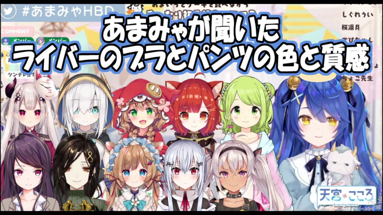 パンツの色を聞くのは過去にほかのライバーがやったけど、ブラの色と質感は初かも。<br>※巴さんの前に健屋が凸ってたのを書くべきでした。配慮が足りませんでした。<br><br><strong>元配信</strong><br>【誕生日凸待ち】ひとりでもケーキ食べれますけど!□【天宮こころ/にじさんじ】<br><span style="color: #1b95e0;">#あまみゃHBD</span> <span style="color: #1b95e0;"><a href="https://youtu.be/DSEbZbjwZNI" target="_blank" rel="noopener nofollow">https://youtu.be/DSEbZbjwZNI</a> </span><br><br><strong>※7月2日4時53分更新</strong><br>天宮こころ<br><a href="https://www.youtube.com/channel/UCkIimWZ9gBJRamKF0rmPU8w" target="_blank" rel="noopener nofollow">https://www.youtube.com/channel/UCkIimWZ9gBJRamKF0rmPU8w</a><br>森中花咲<br><a href="https://www.youtube.com/channel/UCtpB6Bvhs1Um93ziEDACQ8g" target="_blank" rel="noopener nofollow">https://www.youtube.com/channel/UCtpB6Bvhs1Um93ziEDACQ8g</a><br>癒月ちょこ<br><a href="https://www.youtube.com/channel/UC1suqwovbL1kzsoaZgFZLKg" target="_blank" rel="noopener nofollow">https://www.youtube.com/channel/UC1suqwovbL1kzsoaZgFZLKg</a><br>愛園愛美<br><a href="https://www.youtube.com/channel/UC0WwEfE-jOM2rzjpdfhTzZA" target="_blank" rel="noopener nofollow">https://www.youtube.com/channel/UC0WwEfE-jOM2rzjpdfhTzZA</a><br>白雪巴<br><a href="https://www.youtube.com/channel/UCuvk5PilcvDECU7dDZhQiEw" target="_blank" rel="noopener nofollow">https://www.youtube.com/channel/UCuvk5PilcvDECU7dDZhQiEw</a><br>葉加瀬冬雪<br><a href="https://www.youtube.com/channel/UCGYAYLDE7TZiiC8U6teciDQ" target="_blank" rel="noopener nofollow">https://www.youtube.com/channel/UCGYAYLDE7TZiiC8U6teciDQ</a><br>奈羅花<br><a href="https://www.youtube.com/channel/UC-o-E6I3IC2q8sAoAuM6Umg" target="_blank" rel="noopener nofollow">https://www.youtube.com/channel/UC-o-E6I3IC2q8sAoAuM6Umg</a><br>郡道美玲<br><a href="https://www.youtube.com/channel/UCeShTCVgZyq2lsBW9QwIJcw" target="_blank" rel="noopener nofollow">https://www.youtube.com/channel/UCeShTCVgZyq2lsBW9QwIJcw</a><br>魔使マオ<br><a href="https://www.youtube.com/channel/UCerkculBD7YLc_vOGrF7tKg" target="_blank" rel="noopener nofollow">https://www.youtube.com/channel/UCerkculBD7YLc_vOGrF7tKg</a><br>アルス・アルマル<br><a href="https://www.youtube.com/channel/UCdpUojq0KWZCN9bxXnZwz5w" target="_blank" rel="noopener nofollow">https://www.youtube.com/channel/UCdpUojq0KWZCN9bxXnZwz5w</a><br>エリー・コニファー<br><a href="https://www.youtube.com/channel/UCpNH2Zk2gw3JBjWAKSyZcQQ" target="_blank" rel="noopener nofollow">https://www.youtube.com/channel/UCpNH2Zk2gw3JBjWAKSyZcQQ</a><br>ラトナ・プティ<br><a href="https://www.youtube.com/channel/UCIG9rDtgR45VCZmYnd-4DUw" target="_blank" rel="noopener nofollow">https://www.youtube.com/channel/UCIG9rDtgR45VCZmYnd-4DUw</a><br>童田明治<br><a href="https://www.youtube.com/channel/UCveZ9Ic1VtcXbsyaBgxPMvg" target="_blank" rel="noopener nofollow">https://www.youtube.com/channel/UCveZ9Ic1VtcXbsyaBgxPMvg</a>
