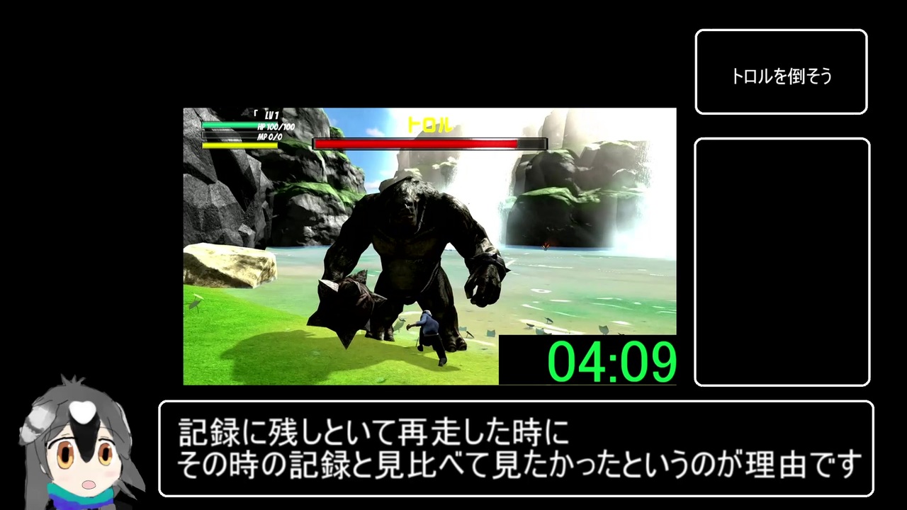 初投稿です<br>はじめから~トロル討伐まで(バグ技あり)のRTAです<br>ただトロル討伐までが好きな人向けです<br><br>偉大なるトロルバグの先駆者様の動画URLです(まぐおじ様)<br><a href="https://twitter.com/M4G_250/status/1280059949435912192?s=19" target="_blank" rel="noopener nofollow">https://twitter.com/M4G_250/status/1280059949435912192?s=19</a><br><br>追記(7月17日更新)更に再走して更新しました<br><a href="https://www.nicovideo.jp/watch/sm37203458" class="watch">sm37203458</a>(5分58秒)(NEW)<br><a href="https://www.nicovideo.jp/watch/sm37179065" class="watch">sm37179065</a>(6分26秒)<br><br>追記(7月17日20時更新)<br>Sylen様、クレッフィ様、紫堂圭斗様、5151様、サディケル様、カニタマ様、焼きうどんナポリタン様、リンク様、s k e a様、橘ギャレン様、とくめい様、めだか監督様、あるぽん様、25シムオリオン様、メタルボーン様、boi様、ひ~ろ~様、アルバス様、むおーでる様、ねむりねこ様、吸血鬼野球拳大好き様、キノコっぽい何か様、わっぽん様、金次様、しばうどん様、bona様、しょ~り様<br>広告ありがとうございますm(__)m<br>本当にこのような動画を広告して頂き本当に嬉しいです、ありがとうございますm(__)m<br><br>追記その2(7月11日更新)<br>試しに投稿した動画だったので10ぐらいいったら嬉しいなという気持ちでしたが、予想を上回り過ぎて大変驚いております……<br>編集に関する事や、世間話に関するコメント等<br>コメントして頂きありがとうございます<br>編集等、無知に等しいので、とても、勉強になりますし次回の動画編集に参考になりますので本当に助かります、少しずつですが改善頑張っていこうと思います<br><br>RTA再走ですが、投稿してから10回ちょい走り直してるのですが、あのタイム越えることが無くて<br>今現在、投稿した動画を見て何かあるんじゃないかと見直してから午後から走り直してみます<br>早めに次の投稿出来るように頑張ります!<br>