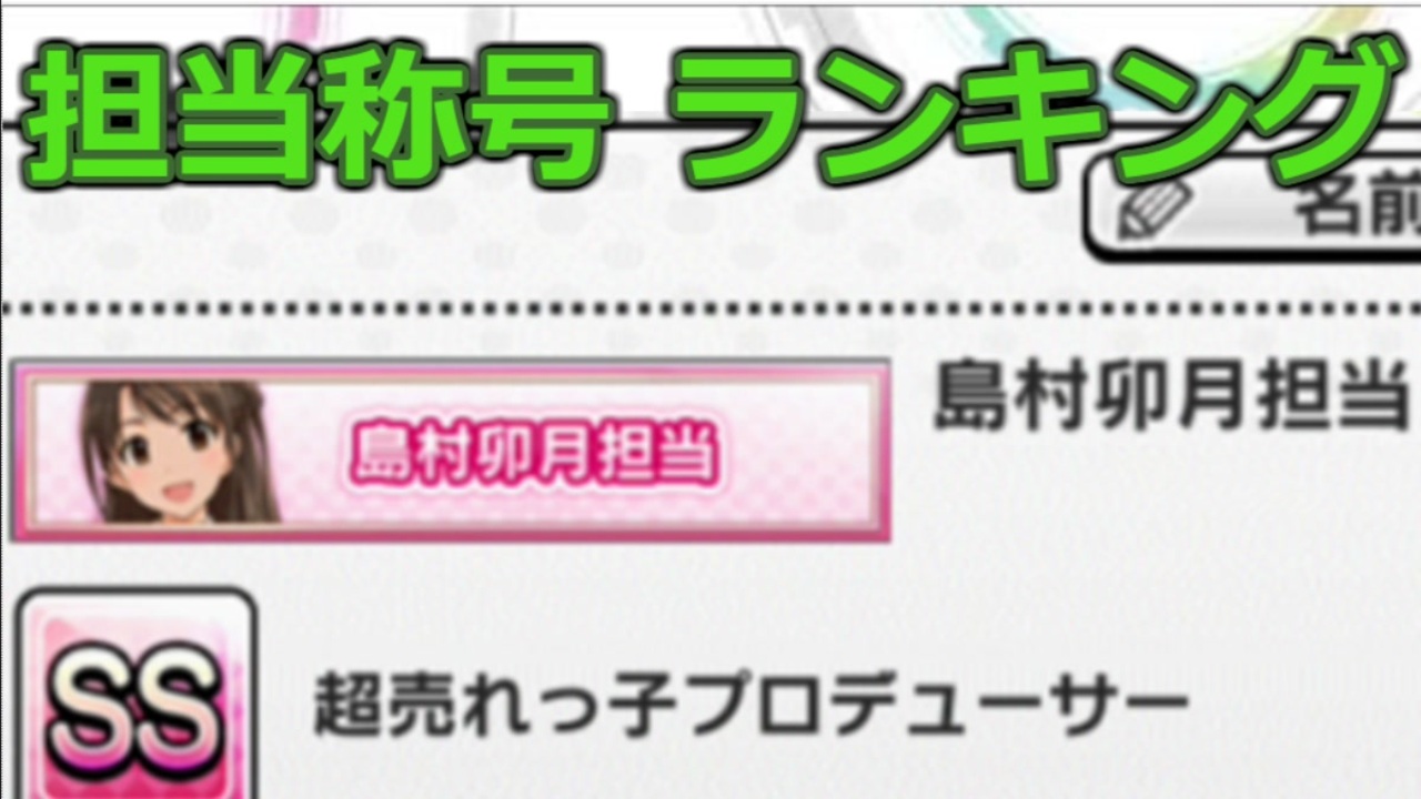 ※ 個人集計の非公式ランキングです。各数値は参考程度にご覧ください。<br><br>~説明~<br>各プロデューサーが設定している担当称号を集計したランキングです。<br>① 「同僚」→「プロデューサー検索」で集計<br>② 担当称号を設定しているプロデューサーが対象<br>③ 各担当称号を「1人」として集計<br>④ 同名の担当称号が2つ設定されていた場合も「1人」として集計<br>⑤ 天空称号も担当称号とする<br><br>~集計期間~<br>ランキング形式イベント期間を除いた <br>2022年9月~2022年12月<br><br>~集計人数~<br>10000人<br><br><span style="color: #000000; font-size: 14px;">~動画構成~ (時間をクリックするとジャンプできます)<br>190位~101位 </span><span style="color: #006699; font-size: 14px;"><a href="#" class="seekTime" data-seekTime="00:50" onclick="seekNicoPlayer('#00:50'); return false;">#00:50</a></span><span style="color: #000000; font-size: 14px;">~</span><br><span style="color: #000000;">100位~51位 </span><span style="color: #006699; font-size: 14px;"><a href="#" class="seekTime" data-seekTime="06:55" onclick="seekNicoPlayer('#06:55'); return false;">#06:55</a></span><span style="color: #000000; font-size: 14px;">~</span><br><span style="color: #000000;">50位~11位 </span><span style="color: #006699; font-size: 14px;"><a href="#" class="seekTime" data-seekTime="10:19" onclick="seekNicoPlayer('#10:19'); return false;">#10:19</a></span><span style="color: #000000; font-size: 14px;">~</span><br><span style="color: #000000;">10位~1位 </span><span style="color: #006699; font-size: 14px;"><a href="#" class="seekTime" data-seekTime="13:44" onclick="seekNicoPlayer('#13:44'); return false;">#13:44</a></span><span style="color: #000000; font-size: 14px;">~</span><br><span style="color: #000000;">まとめ <a href="#" class="seekTime" data-seekTime="14:49" onclick="seekNicoPlayer('#14:49'); return false;">#14:49</a>~</span><br><br>2021年版 → <a href="https://www.nicovideo.jp/watch/sm39630878" class="watch">sm39630878</a><br>2022年版 → <a href="https://www.nicovideo.jp/watch/sm41505314" class="watch">sm41505314</a>