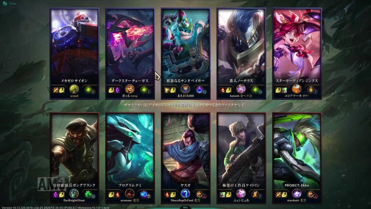 こんにちは。<br><br>3週間ぶり?の投稿となります。<br>ここ最近、休日出勤や諸々の事情により、動画編集の時間が取れなくて遅くなってしまいました。<br><br>■LoLパートナー<br>私はライアットゲームズのLoL公式パートナープログラムに参加しています。 <br>プログラムの詳細はこちらをご覧ください: <a href="https://partners.leagueoflegends.com/" target="_blank" rel="noopener nofollow">https://partners.leagueoflegends.com/</a> <br><br> 【私の投稿動画一覧】<a href="https://www.nicovideo.jp/mylist/34239707" target="_blank" rel="noopener">mylist/34239707</a>、<span style="color: #000000; font-size: 13px;">mylist/</span>67693448<br>【ボタンさん投稿動画一覧】<a href="https://www.nicovideo.jp/mylist/55486174" target="_blank" rel="noopener">mylist/55486174</a><br>【しろまさん投稿動画一覧】<a href="https://www.nicovideo.jp/mylist/57313953" target="_blank" rel="noopener">mylist/57313953</a><br>【Twitter】<a href="https://twitter.com/aryud_lol" target="_blank" rel="noopener nofollow">https://twitter.com/aryud_lol</a><br>【ブログ】<a href="http://botanh.blog.fc2.com/" target="_blank" rel="noopener nofollow">http://botanh.blog.fc2.com/</a><br><br>【504戦目】<a href="https://www.nicovideo.jp/watch/sm37031722" class="watch">sm37031722</a> 【506戦目】<a href="https://www.nicovideo.jp/watch/sm37211572" class="watch">sm37211572</a>