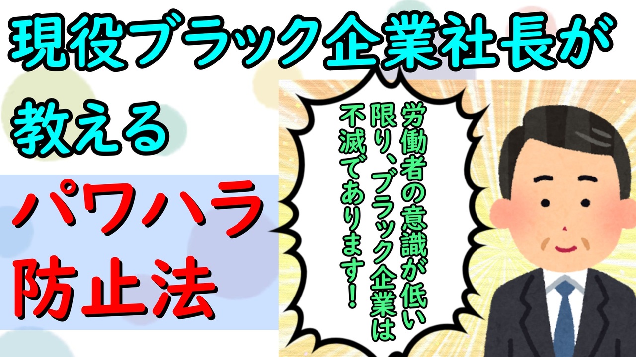 <span style="color: #000000; font-size: 14px;">前</span><a href="https://www.nicovideo.jp/watch/sm36609437" class="watch">sm36609437</a><br><br>厚生労働省「職場におけるパワーハラスメント対策が事業主の義務になりました!」<br><a href="https://jsite.mhlw.go.jp/tokyo-roudoukyoku/content/contents/000656438.pdf" target="_blank" rel="noopener nofollow">https://jsite.mhlw.go.jp/tokyo-roudoukyoku/content/contents/000656438.pdf</a><br><br><span style="color: #000000; font-size: 13px;"><strong>現役ブラック企業社長が教えるシリーズマイリスト</strong></span><br><span style="color: #006699; font-size: 14px;"><a href="https://www.nicovideo.jp/mylist/64132821" target="_blank" rel="noopener">mylist/64132821</a></span><span style="color: #000000; font-size: 14px;"> </span><br><span style="color: #000000; font-size: 14px;"><strong>その他動画</strong></span><br><span style="color: #006699; font-size: 14px;"><a href="https://www.nicovideo.jp/mylist/54754050" target="_blank" rel="noopener">mylist/54754050</a></span><br><br><span style="color: #000000; font-size: 14px;">Fの就職情報</span><span style="color: #006699; font-size: 14px;"><a href="https://f-syukatu.com" target="_blank" rel="noopener nofollow">https://f-syukatu.com</a></span><br><br><span style="color: #000000; font-size: 14px;"><strong>youtubeチャンネル</strong></span><br><span style="color: #006699; font-size: 14px;"><a href="https://www.youtube.com/playlist?list=PLCjQBaWqLbQ3PSHosCZE-stWkEtyUZ051" target="_blank" rel="noopener nofollow">https://www.youtube.com/playlist?list=PLCjQBaWqLbQ3PSHosCZE-stWkEtyUZ051</a></span><br><br><span style="color: #000000; font-size: 14px;"><strong>ツイッター</strong></span><br><span style="color: #006699; font-size: 14px;"><a href="https://twitter.com/F_kokutiyou" target="_blank" rel="noopener nofollow">https://twitter.com/F_kokutiyou</a></span>