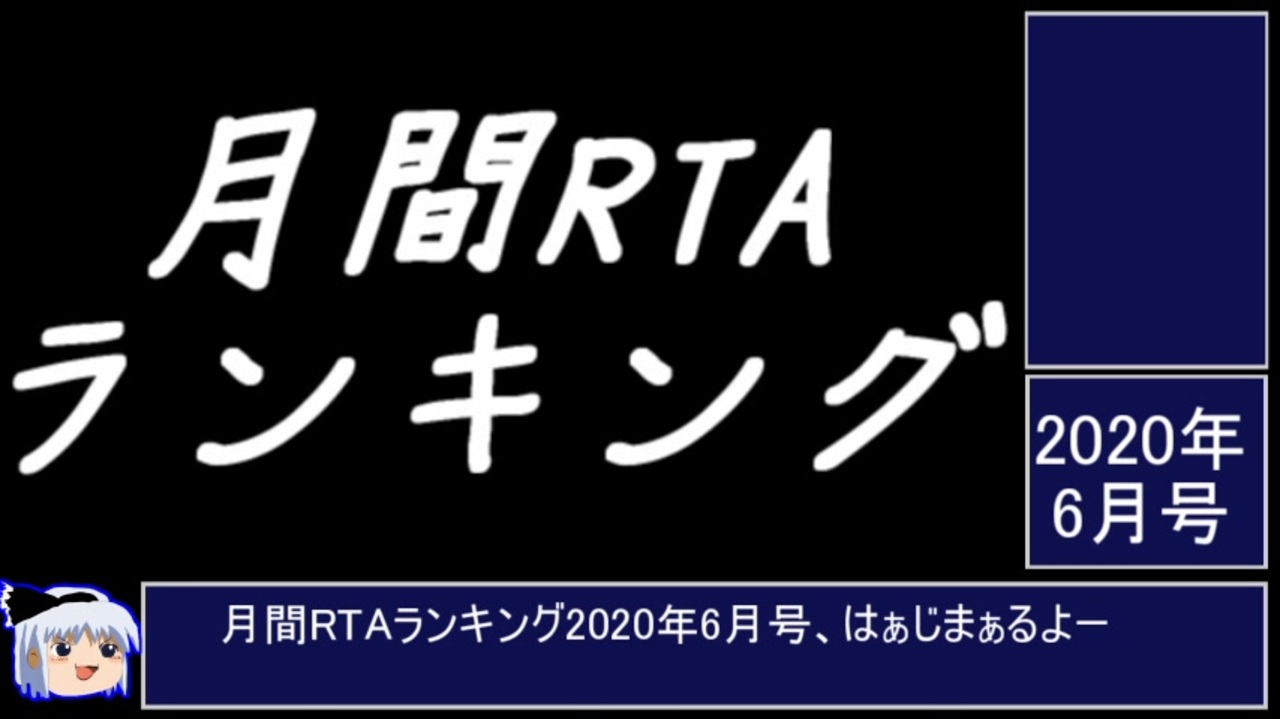 <span style="font-size: 16px;">追記:下記動画を集計時に誤って除外してしまっていました。<br>当時の記録が手元に無い為、推定となりますが14位以降の順位は一つ繰り下げの結果となります。<br>今回は本当申し訳ありませんでした。<br>じゅうべえくえすとRTA_7時間27分24秒_part1/10【<a href="https://www.nicovideo.jp/watch/sm37094516" class="watch">sm37094516</a>】</span><br><br>先月の遅刻も兼ねて早投稿です。<br>◆対象動画:2020年6月1日00:00:00~2020年6月30日23:59:59の期間に投稿された、「RTA」タグがついている動画 <br>◆集計日時:2020年7月12日 <br>◆ポイント算出方法:再生数+コメント数+(マイリスト数×20) <br>◆同じシリーズの動画はポイント最多以外除外。再走は別シリーズ扱い。 1位~100位(<a href="https://www.nicovideo.jp/mylist/68986423" target="_blank" rel="noopener">mylist/68986423</a>) <br>ブロマガの方にてお願いを書かせて戴いてるので 宜しければ 一読よろしくお願いします。 【<a href="https://ch.nicovideo.jp/article/ar1438685" target="_blank" rel="noopener">ar1438685</a>】 <br><br><br><span style="color: #000000; font-size: 14px;">2020年5月号→<a href="https://www.nicovideo.jp/watch/sm37118307" class="watch">sm37118307</a> 2020</span>年7月号→<a href="https://www.nicovideo.jp/watch/sm37449983" class="watch">sm37449983</a>