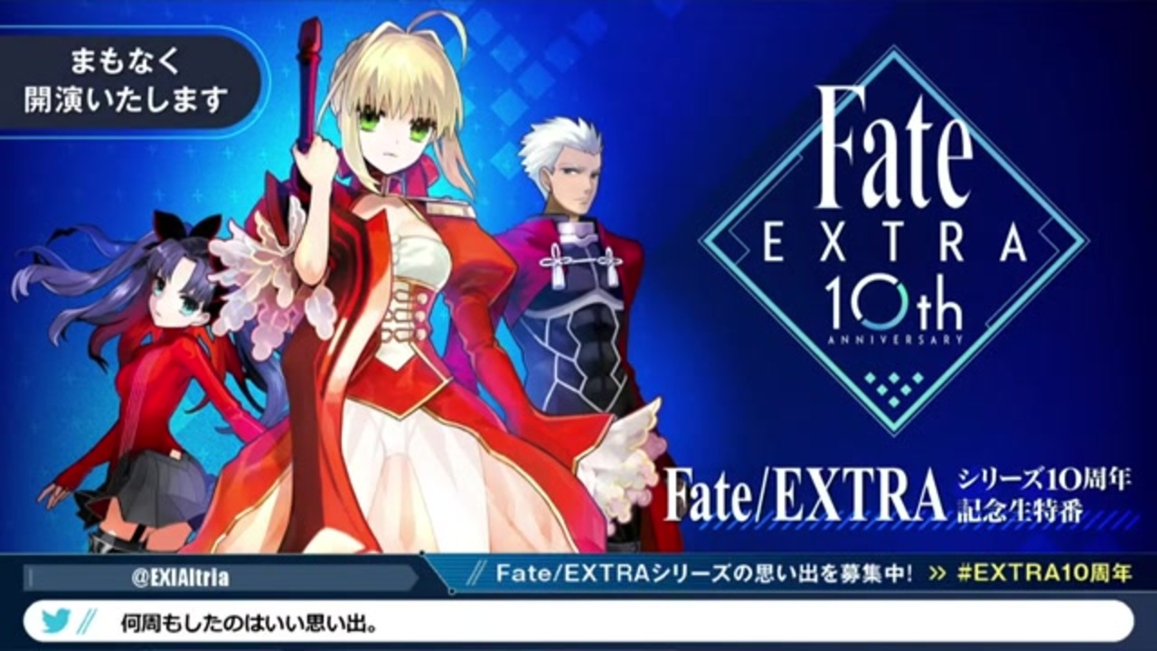 <span style="color: #030303; font-size: 14px;">Fate/EXTRA発売10周年を記念した特別な生放送をお送りします!<br>番組では本日発表された『Fate/EXTRA Record』や、Fate/EXTRAシリーズの最新情報をお届け。<br><br>今回はFateシリーズではおなじみの、遠坂凛さん出演!<br>さらに、遠坂凛役 植田佳奈さん、TYPE-MOON studio BB スタジオディレクターの新納一哉さんが出演します。<br><br>Fate/EXTRAシリーズの思い出をファンのみなさんと振り返りながら10周年をお祝いしましょう!<br><br>※画面は開発中のものです<br>※『Fate/EXTRA Record』は仮称です</span><br><br><br />Fate関係マイリスト作りました<br>過去の動画はこちらからどうぞ<br>【Part6】<a href="https://www.nicovideo.jp/mylist/77458014" target="_blank" rel="noopener">mylist/77458014</a><br>【Part5】<a href="https://www.nicovideo.jp/mylist/72367759" target="_blank" rel="noopener">mylist/72367759</a><br>【Part4】<a href="https://www.nicovideo.jp/mylist/69569102" target="_blank" rel="noopener">mylist/69569102</a><br>【Part3】<a href="https://www.nicovideo.jp/mylist/66190415" target="_blank" rel="noopener">mylist/66190415</a><br>【Part2】<a href="https://www.nicovideo.jp/mylist/63296233" target="_blank" rel="noopener">mylist/63296233</a><br>【Part1】<a href="https://www.nicovideo.jp/mylist/60253726" target="_blank" rel="noopener">mylist/60253726</a><br><br><br>