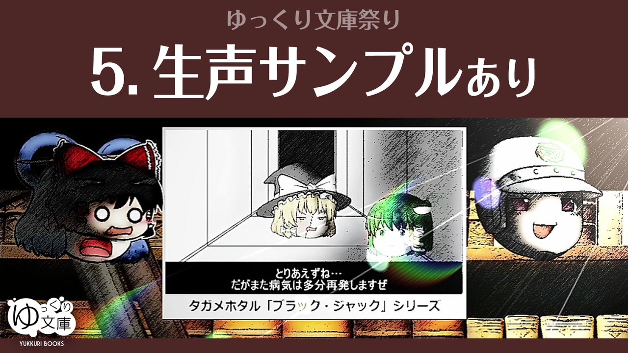 <span style="color: red;"><strong>090x5 テコ入れ──</strong></span><br>ウソ予告は文庫サーバに収集され、メンバーによる鑑賞会が開催される。このとき書き込まれたコメントを統合して、代表アバター(紙袋)の言動が決まる。なんだけど今回はまた固有アバターでやることになった。<br>次? そんな先のことはわからない。<br><br>●ゆっくり文庫祭り<br><a href="https://www.nicovideo.jp/watch/sm37057377" class="watch">sm37057377</a> ウソ予告:予告<br><a href="https://www.nicovideo.jp/watch/sm37057819" class="watch">sm37057819</a> まとめ1:初手は私たちから<br><a href="https://www.nicovideo.jp/watch/sm37107566" class="watch">sm37107566</a> まとめ2:祭りの主旨は<br><a href="https://www.nicovideo.jp/watch/sm37137887" class="watch">sm37137887</a> まとめ3:かぶりウェルカム<br><a href="https://www.nicovideo.jp/watch/sm37180688" class="watch">sm37180688</a> まとめ4:文庫スペシャル<br><a href="https://www.nicovideo.jp/watch/sm37232413" class="watch">sm37232413</a> まとめ5:生声サンプルあり★<br><a href="https://www.nicovideo.jp/watch/sm37552205" class="watch">sm37552205</a> まとめ6:伝え合う<br><a href="https://www.nicovideo.jp/watch/sm37598563" class="watch">sm37598563</a> まとめ7:ある投稿者の物語<br><a href="https://www.nicovideo.jp/watch/sm37246611" class="watch">sm37246611</a> ファンアートまとめ<br><br>●紹介された動画<br><a href="https://www.nicovideo.jp/watch/sm34400707" class="watch">sm34400707</a> スケキヨ「走れメロス」<br><a href="https://www.nicovideo.jp/watch/sm31850121" class="watch">sm31850121</a> ゆっくり文庫「グリム兄弟の足あと」<br><a href="https://www.nicovideo.jp/watch/sm36487854" class="watch">sm36487854</a> タガメホタル「ブラック・ジャック」シリーズ<br><a href="https://www.nicovideo.jp/watch/sm32087020" class="watch">sm32087020</a> ゆっくり文庫「阿部一族」<br><a href="https://www.nicovideo.jp/watch/sm25458371" class="watch">sm25458371</a> ゆっくり文庫「スズメバチの巣」<br><a href="https://www.nicovideo.jp/watch/sm36214041" class="watch">sm36214041</a> 煉瓦「ゾンビ対数学」<br><a href="https://www.nicovideo.jp/watch/sm36702049" class="watch">sm36702049</a> スケキヨ「びっくり箱殺人事件」<br><a href="https://www.nicovideo.jp/watch/sm34970284" class="watch">sm34970284</a> 蒼天退路「100万回いきたねこ」<br><a href="https://www.nicovideo.jp/watch/sm27103362" class="watch">sm27103362</a> ゆっくり文庫「銀河鉄道の夜:カムパネルラ視点」<br><br>●ゆっくり文庫<br><a href="https://www.nicovideo.jp/mylist/39107052" target="_blank" rel="noopener">mylist/39107052</a> [001-]<br><a href="https://www.nicovideo.jp/mylist/63625257" target="_blank" rel="noopener">mylist/63625257</a> [060-]<br><a href="https://www.nicovideo.jp/mylist/71854227" target="_blank" rel="noopener">mylist/71854227</a> [101-]<br>近況:<a href="https://twitter.com/trynext" target="_blank" rel="noopener nofollow">https://twitter.com/trynext</a><br><br>