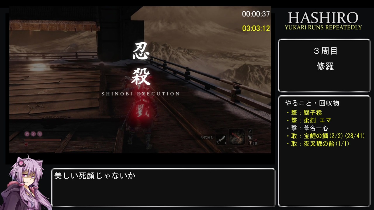 本動画は『SEKIRO - SHADOWS DIE TWICE -』のトロコンRTAとなります。<br><br>「それはいわゆる、コラテラルダメージというものに過ぎない。葦名の地を守る為の、致し方ない犠牲だ。」<br><br>内府も寄り付かなくなるだろうから守れてるとは思う(個人の感想です)<br>動画投稿って自分の好きを公開する場ですよね?<br><br><レギュレーション><br>・PS4版 Ver1.04<br>・タイムはIGT(目安として右上にタイマー設置)<br>・バグなし<br>・バックアップ禁止<br>・意図的なゲーム強制終了の禁止<br><br>part1 :<a href="https://www.nicovideo.jp/watch/sm37036921" class="watch">sm37036921</a> 前回:<a href="https://www.nicovideo.jp/watch/sm37213576" class="watch">sm37213576</a> 次回 :<a href="https://www.nicovideo.jp/watch/sm37282305" class="watch">sm37282305</a><br>マイリスト:<a href="https://www.nicovideo.jp/mylist/68653429" target="_blank" rel="noopener">mylist/68653429</a><br><br>URA様 八ク寺P様 匿名様 yanakki1106様 bt-74様 Takahom様 辛党様 水科 澄河様<br>ncr様 0507_hajime様 JACK様 惡雌叢雲様 Strong様 ユタラプトル様 猫野和錆様<br>Ruinmaker様 DHOLI様 赤城 大和様 木星様 ジオ様 篝火草@怜様 minazki様<br>《♪銀河の裁きに勝てるもの無し》様 剣崎様 子蓉様 もちねこ様 まれい様 脂煙様<br>緑水様 EoAoY様 はみチン様<br><br>いつも数多くの広告、ありがとうございます!<br /><br>パート1集:<a href="https://www.nicovideo.jp/mylist/65985766" target="_blank" rel="noopener">mylist/65985766</a><br>Twitter(主に投稿連絡用):<a href="https://twitter.com/fSeasons78" target="_blank" rel="noopener nofollow">https://twitter.com/fSeasons78</a>