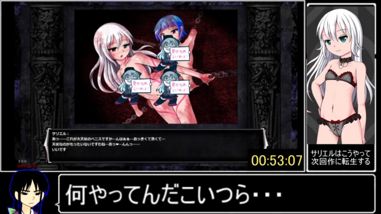 最近のトレンドはオナホ化して排泄される奴ですね<br><br>人生初の一括投稿です。<br><br>レギュレーション<br>・一周目プレイ<br>・Sエンド達成<br><br>計測区間<br>ニューゲーム開始~最終ステージリザルト画面でクリアランクが表示されるまで<br><br>前<a href="https://www.nicovideo.jp/watch/sm37247918" class="watch">sm37247918</a><br>マイリスト<a href="https://www.nicovideo.jp/mylist/58145266" target="_blank" rel="noopener">mylist/58145266</a>