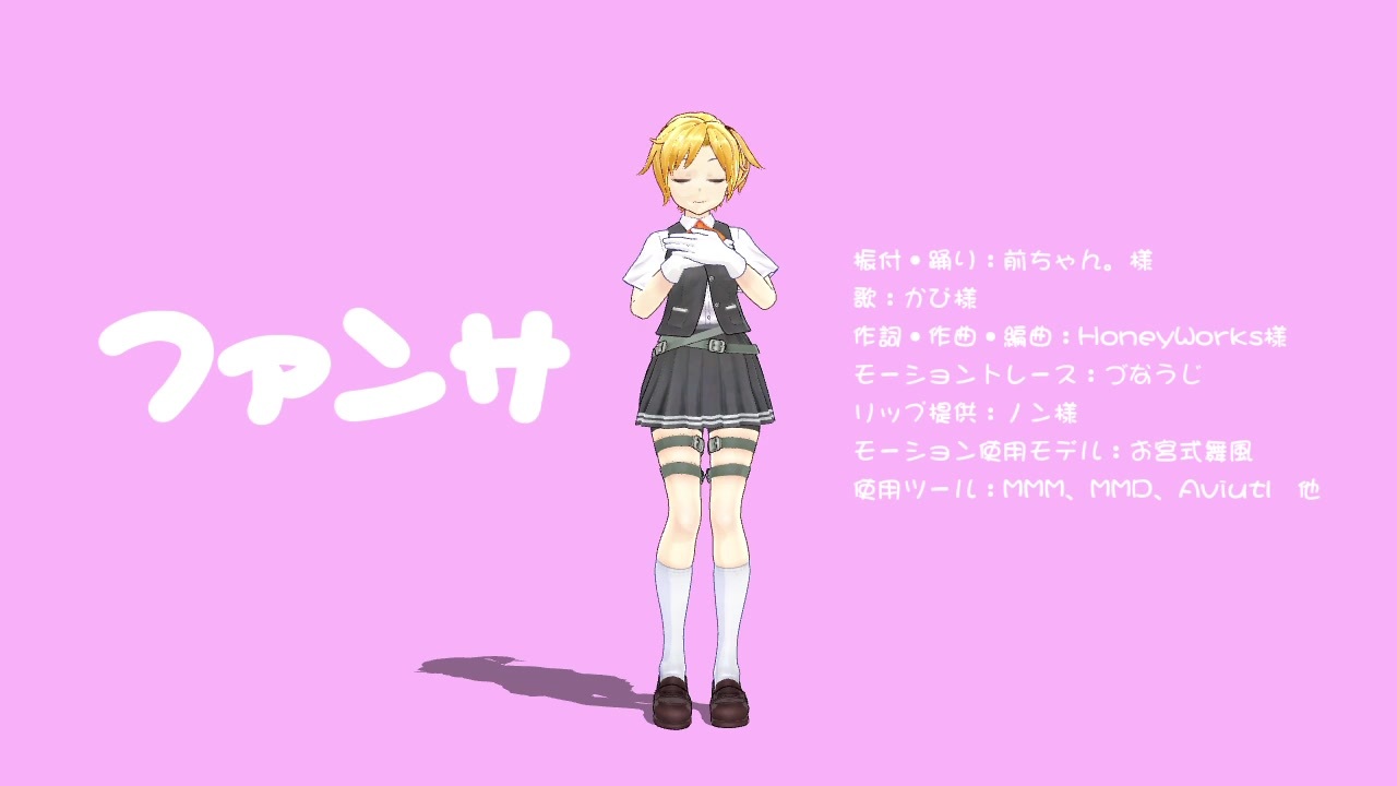 すばらしい楽曲、すばらしい振付と踊りに感謝します。<br>このモーションのご利用にあたっては、readmeをご一読ください。<br><br>モーション配布先:<a href="https://bowlroll.net/file/232288" target="_blank" rel="noopener nofollow">https://bowlroll.net/file/232288</a><br><br>「ファンサ」<br>振付・踊り:前ちゃん。様 <a href="https://www.nicovideo.jp/watch/sm36799057" class="watch">sm36799057</a><br>作詞・作曲・編曲:HoneyWorks様 <a href="https://www.nicovideo.jp/watch/sm35288422" class="watch">sm35288422</a><br>使用音源:かぴ様 <a href="https://www.nicovideo.jp/watch/sm35304711" class="watch">sm35304711</a><br>モーショントレース:づなうじ ツイッター:@dunauzi<br>リップ作成:ノン様<br>モーション使用モデル:お宮式舞風 <a href="https://www.nicovideo.jp/watch/sm28414111" class="watch">sm28414111</a><br>アイテム:MMD・MMM・Aviutl・その他<br><br>