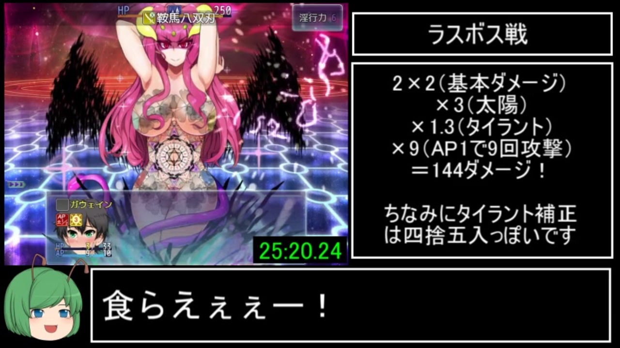 <br>©2017-2020 しがのま 様<br><br>パンドラの森 ~ソウセイの淫魔と堕落の牧場~のRTA動画になります。<br>ゲーム本体は下記リンクからお願いします<br><br>計測区間 「New Gameを押した時」~「ラスボス討伐時の勝利メッセージが出た時」<br><br>ゲームレビューはこちら<br><a href="https://doujin-reviewers.info/reviews/cda123924d3ef321a0a9" target="_blank" rel="noopener nofollow">https://doujin-reviewers.info/reviews/cda123924d3ef321a0a9</a><br><br>チャートの解説はこちら<br><a href="http://urban-doujingame.com/2020/04/26/1248/" target="_blank" rel="noopener nofollow">http://urban-doujingame.com/2020/04/26/1248/</a><br><br>前編><a href="https://www.nicovideo.jp/watch/sm36747137" class="watch">sm36747137</a><br>RTA part1マイリスト><a href="https://www.nicovideo.jp/mylist/72505859" target="_blank" rel="noopener">mylist/72505859</a><br><br><br>※追記(2020/08/15)<br>ブログにて宣伝へのお礼、コメント返信を実施しました<br><a href="http://urban-doujingame.com/2020/08/12/1256/" target="_blank" rel="noopener nofollow">http://urban-doujingame.com/2020/08/12/1256/</a><br><br><br>※注意<br>諸事情により、最新版ではなくVer.1.065での記録となっております<br>投稿当時の最新版は2020/08/01のVer1.21です<br><br>※訂正<br>技名を修正します、作者様すいません<br>×鞍馬八双刀(くらまはっそうとう)<br>〇鞍馬八双刃(くらまはっそうじん)
