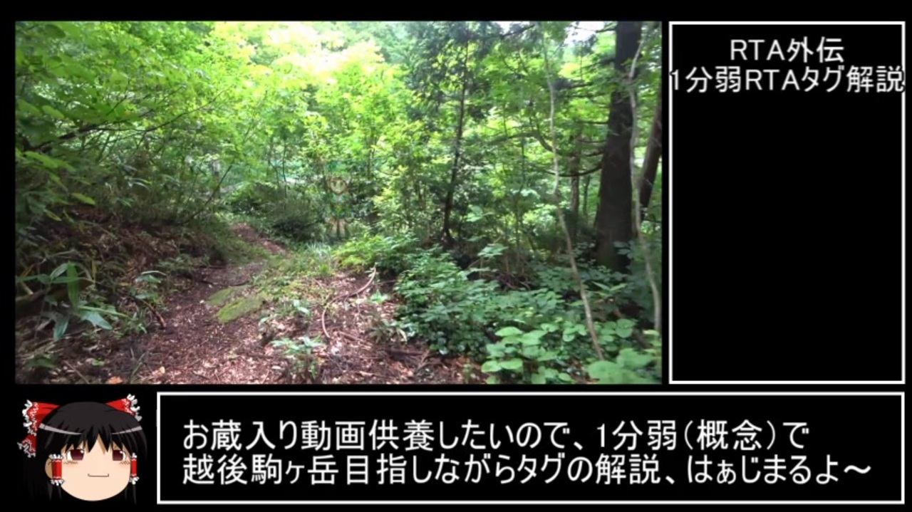 本編編集の息抜きに、お蔵入り予定の越後駒ヶ岳の記録供養を思い立ったところ<br>運営が1分弱タグ紹介キャンペーンやってたので、申し訳程度に乗っかってみました<br><br>紹介動画<br>やまおとこ兄貴:<a href="https://www.nicovideo.jp/watch/sm31102077" class="watch">sm31102077</a><br>こちらを紹介せずにタグ紹介はできまいよ<br><br>その他、用語紹介はニコニコ大百科の『RTA(リアル登山アタック)』<br>の記述内容を参照しております<br><br><span style="font-size: 14px;">前回(</span><a href="https://www.nicovideo.jp/watch/sm37158896" class="watch">sm37158896</a><span style="font-size: 14px;">)</span><br>次回(<a href="https://www.nicovideo.jp/watch/sm37343624" class="watch">sm37343624</a>)<br>過去RTA結果はこちら<br>RTA(リアル登山アタック):<span style="font-size: 14px;"><a href="https://www.nicovideo.jp/mylist/66608761" target="_blank" rel="noopener">mylist/66608761</a></span>