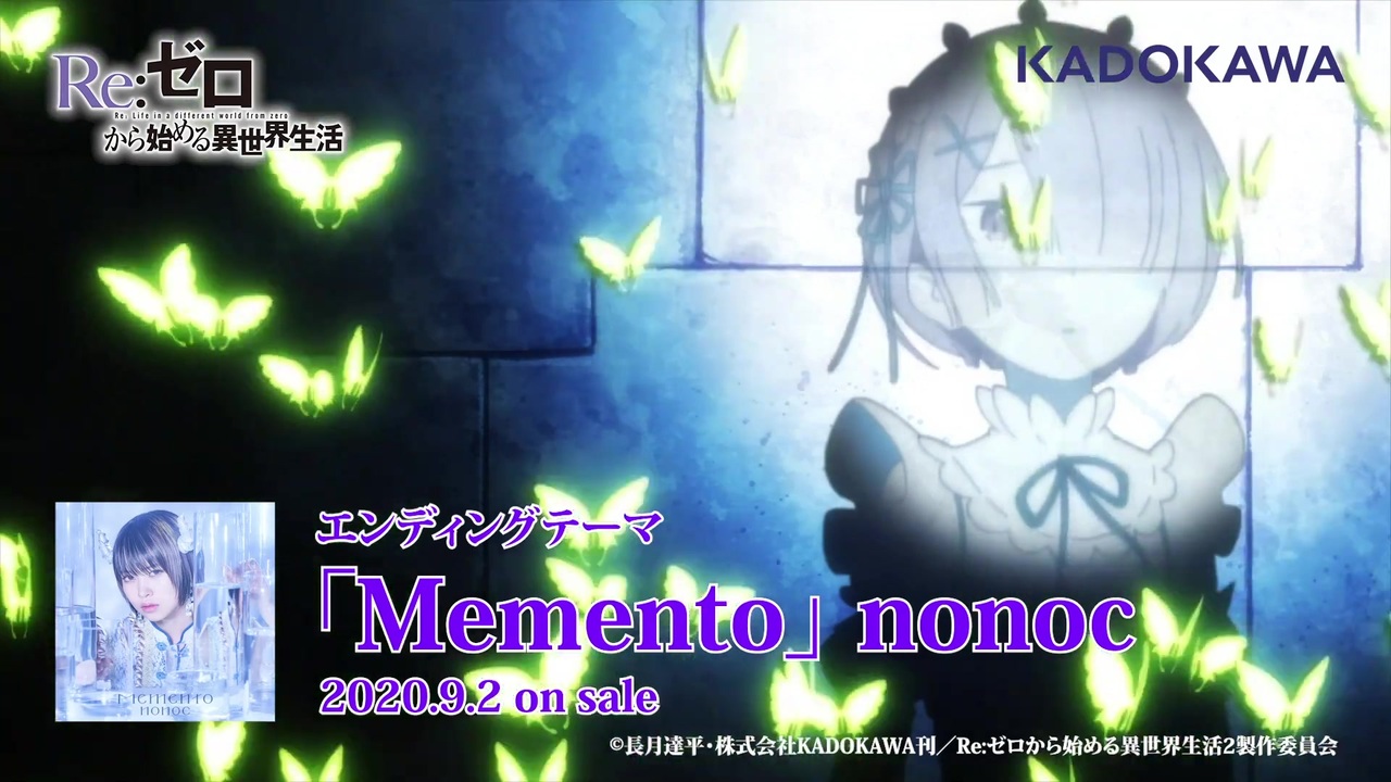 nonoc 「Memento」<br>(TVアニメ「Re:ゼロから始める異世界生活」2nd season エンディングテーマシングル)<br>2020年9月2日発売<br><br>収録曲:<br>1.「Memento」 作詞:hotaru 作編曲:Tom-H@ck<br>2.「雪の果てに君の名を」 作詞:烏屋茶房 作曲:ヒゲドライバー・Powerless 編曲:Powerless<br>発売・販売:株式会社KADOKAWA<br><br>-nonoc-<br>北海道出身・在住のシンガー。高校在学中に札幌を拠点とするプロデューサー安田史生氏と出会い、本格的に 音楽活動をスタート。 2018年、その歌声がKADOKAWA制作陣の耳に届き、<br>OVA映画「Re:ゼロから始める異世界生活 Memory Snow」テーマ曲のボーカルに抜擢。<br>2019年には、1stシングル「KODO」(TVアニメ「魔法少女特殊戦あす か」OP)、<br>2ndシングル「star*frost」(TVアニメ「彼方のアストラ」OP)をリリース。 <br>現在事前登録受付中のリゼロの公式アプリゲーム「Re:ゼロから始める異世界生活 Lost in Memories」の主題歌も担当。<br>いま要注目の新星アーティスト。 <br><br><br>TV『Re:ゼロから始める異世界生活』2nd season<br>2020.7.8 ON AIR START!<br><br>俺が必ず、お前を救ってみせる。<br>魔女教大罪司教「怠惰」担当ペテルギウス・ロマネコンティを打倒し、エミリアとの再開を果たしたナツキ・スバル。辛い決別を乗り越え、ようやく和解した二人だったが、それは新たな波乱の幕開けだった。<br>想像を超える絶体絶命の危機、そして襲い来る無慈悲な現実。少年は再び過酷な運命に立ち向かう。