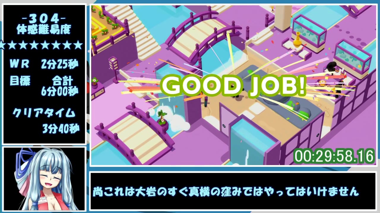 レギュ的に長いステージが続いたのと大ガバをやらかしたので動画時間が思いのほか伸びてしまった…。<br><br>あと〝無損害〟について勘違いが起きてそうだったので補足(動画内でも一応触れます)<br>無損害Any%レギュは<br>「<strong><i>損害出たらハイオワリ、データ消して最初から走り直してねー</i></strong>」<br>ではなく<br>「<strong>全ステージ必ず一回は損害なしでクリアせんとタイム認めんで</strong>」<br>な感じなので、<span style="color: #0000ff;">仮に損害を出してもその部屋の仕事をやり直し一回でも損害なしでクリアすればOKとなります。</span><br><br>説明不足と紛らわしくてゴメンネ!苦情はルール制定した人に言ってね!<br><br>世界記録↓<br><span style="color: #006699;"><a href="https://www.speedrun.com/good_job/full_game#New_Game_Any_Damageless" target="_blank" rel="noopener nofollow">https://www.speedrun.com/good_job/full_game#New_Game_Any_Damageless</a></span><br>ようつべの無編集版↓<br><a href="https://www.youtube.com/watch?v=enFl8yPMMic&t=77s" target="_blank" rel="noopener nofollow">https://www.youtube.com/watch?v=enFl8yPMMic&t=77s</a><br><br>前→<a href="https://www.nicovideo.jp/watch/sm37248661" class="watch">sm37248661</a> 次→<a href="https://www.nicovideo.jp/watch/sm37388043" class="watch">sm37388043</a><br>RTAマイリス→<span style="color: #006699;"><a href="https://www.nicovideo.jp/mylist/68894358" target="_blank" rel="noopener">mylist/68894358</a></span>