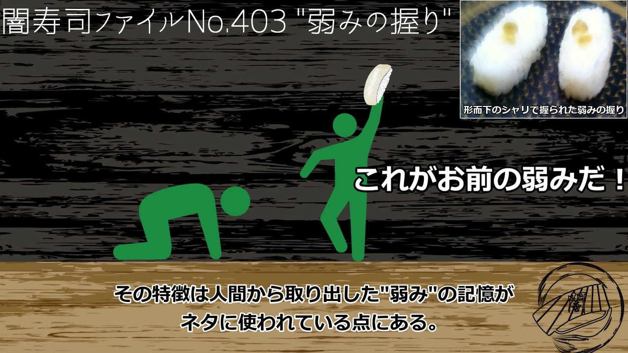 闇寿司<br><br>前→(<a href="https://www.nicovideo.jp/watch/sm37295831" class="watch">sm37295831</a>) 次→(<a href="https://www.nicovideo.jp/watch/sm37304013" class="watch">sm37304013</a>)<br><br>マイリスト(<a href="https://www.nicovideo.jp/mylist/68596777" target="_blank" rel="noopener">mylist/68596777</a>)<br><br>【きみょんなSCP紹介】(<a href="https://www.nicovideo.jp/mylist/65586082" target="_blank" rel="noopener">mylist/65586082</a>) <br>【SCP紹介タイムアタック】→(<a href="https://www.nicovideo.jp/mylist/67888696" target="_blank" rel="noopener">mylist/67888696</a>)<br>【東方二次創作】→(<a href="https://www.nicovideo.jp/mylist/68600326" target="_blank" rel="noopener">mylist/68600326</a>)<br><br><span style="color: rgba(0, 0, 0, 0.87); font-size: 15px;">Author: dainozaurs<br>Title: 闇寿司ファイルNo.403 "弱みの握り"<br>Source: <a href="http://scp-jp.wikidot.com/yamizushi-file-no403" target="_blank" rel="noopener nofollow">http://scp-jp.wikidot.com/yamizushi-file-no403</a><br>CC BY-SA 3.0<br><br>Author bamboon<br>TitleSCP-1134-JP「爆転ニギリ スシブレード」<br>Source: </span><a href="http://scp-jp.wikidot.com/scp-1134-jp" target="_blank" rel="noopener nofollow">http://scp-jp.wikidot.com/scp-1134-jp</a><br><br><span style="color: rgba(0, 0, 0, 0.87); font-size: 15px;">闇寿司 ロゴ<br>yami.sushi<br>created by tutuji<br><a href="http://scp-jp.wikidot.com/yamisushi-logo" target="_blank" rel="noopener nofollow">http://scp-jp.wikidot.com/yamisushi-logo</a><br><br>CC BY-SA 3.0</span><br>SCP Foundation( <a href="http://www.scp-wiki.net/)" target="_blank" rel="noopener nofollow">http://www.scp-wiki.net/)</a><br>SCP財団(<a href="http://ja.scp-wiki.net/)" target="_blank" rel="noopener nofollow">http://ja.scp-wiki.net/)</a><br>CC-BY-SA 3.0<br><br>Twitter(<a href="https://mobile.twitter.com/hidariueAika_" target="_blank" rel="noopener nofollow">https://mobile.twitter.com/hidariueAika_</a><br><br>※動画投稿者コメントで気分を害した方がいるみたいで、申し訳ございません。もうちょっと考えてから書くようにします。全然途中で視聴をやめてもらっても大丈夫ですし、「いいね」は特に要りません。2020/08/07 追記