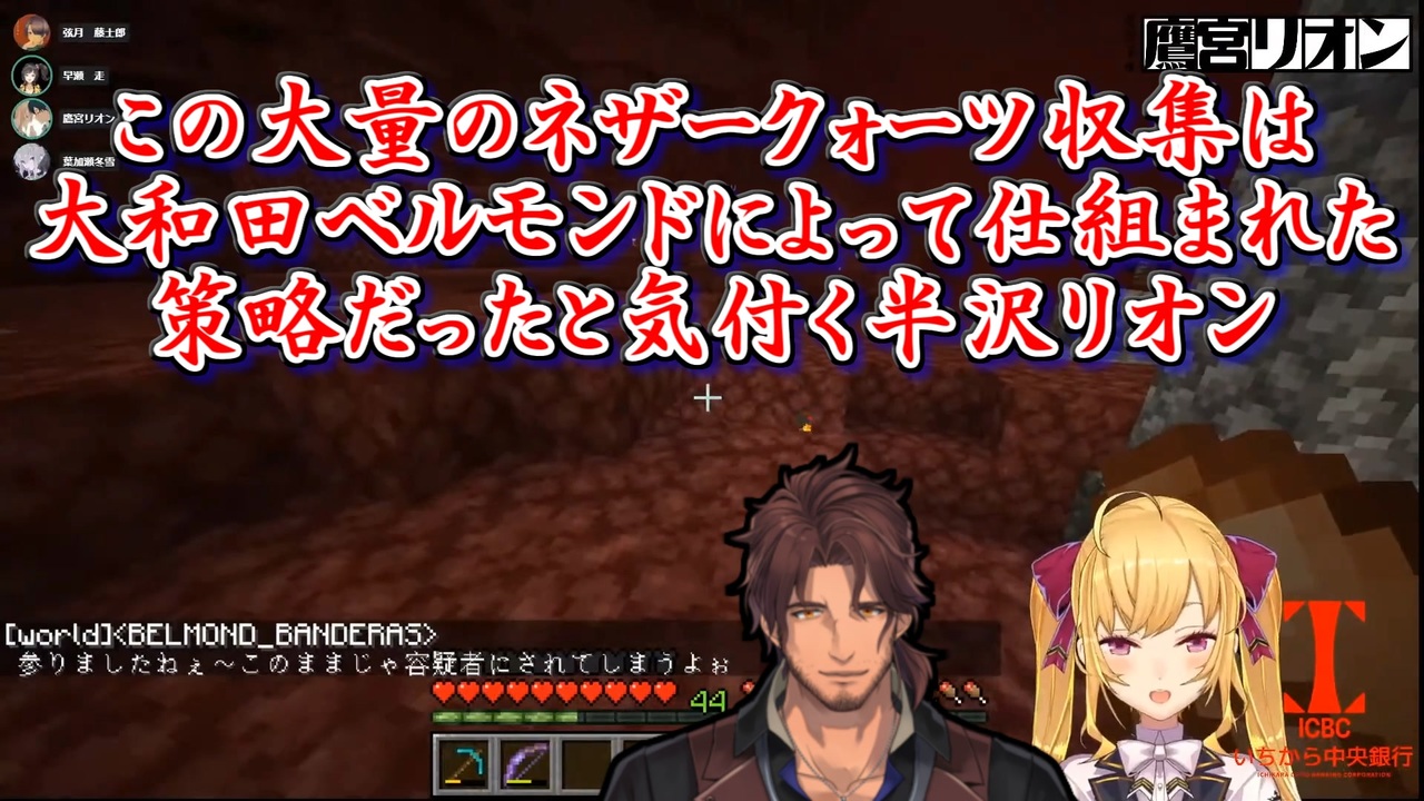 まさか我が切り抜きがまんま同時視聴されるとは思わんかったw<br>さすがだお嬢!<br>にじさんじ版半沢直樹、本格的に始まってきたな<br><br>こちら前回のあらすじ(参考に上がった切り抜き動画)↓<br><a href="https://www.nicovideo.jp/watch/sm37298460" class="watch">sm37298460</a><br><br>本家参考動画<br>・鷹宮リオン<br>【Minecraft】ネザークオーツ8500個回収できなければ出向!?#02【にじさんじ/鷹宮リオン】<br><a href="https://youtu.be/GmBPvuBcfrA" target="_blank" rel="noopener nofollow">https://youtu.be/GmBPvuBcfrA</a><br><br>参考チャンネル<br>・鷹宮リオン<br><a href="https://www.youtube.com/channel/UCV5ZZlLjk5MKGg3L0n0vbzw" target="_blank" rel="noopener nofollow">https://www.youtube.com/channel/UCV5ZZlLjk5MKGg3L0n0vbzw</a><br>・早瀬走<br><a href="https://www.youtube.com/channel/UC2OacIzd2UxGHRGhdHl1Rhw" target="_blank" rel="noopener nofollow">https://www.youtube.com/channel/UC2OacIzd2UxGHRGhdHl1Rhw</a><br>・葉加瀬冬雪<br><a href="https://www.youtube.com/channel/UCGYAYLDE7TZiiC8U6teciDQ" target="_blank" rel="noopener nofollow">https://www.youtube.com/channel/UCGYAYLDE7TZiiC8U6teciDQ</a><br>・弦月藤士郎<br><a href="https://www.youtube.com/channel/UCGw7lrT-rVZCWHfdG9Frcgg" target="_blank" rel="noopener nofollow">https://www.youtube.com/channel/UCGw7lrT-rVZCWHfdG9Frcgg</a><br>・ベルモンド・バンデラス<br><a href="https://www.youtube.com/channel/UCbc8fwhdUNlqi-J99ISYu4A" target="_blank" rel="noopener nofollow">https://www.youtube.com/channel/UCbc8fwhdUNlqi-J99ISYu4A</a><br><br>参考元主Twitter<br>・鷹宮リオン<br><a href="https://twitter.com/TakamiyaRion" target="_blank" rel="noopener nofollow">https://twitter.com/TakamiyaRion</a><br>・早瀬走<br><a href="https://twitter.com/SouHayase" target="_blank" rel="noopener nofollow">https://twitter.com/SouHayase</a><br>・葉加瀬冬雪<br><a href="https://twitter.com/Hakase_Fuyuki" target="_blank" rel="noopener nofollow">https://twitter.com/Hakase_Fuyuki</a><br>・弦月藤士郎<br><a href="https://twitter.com/1O46V" target="_blank" rel="noopener nofollow">https://twitter.com/1O46V</a><br>・ベルモンド・バンデラス<br><a href="https://twitter.com/belmond_b_2434" target="_blank" rel="noopener nofollow">https://twitter.com/belmond_b_2434</a><br><br>ニコニコのダイコンマンリスト<br>「バーチャルYouTuberシリーズ」↓<br><a href="https://www.nicovideo.jp/mylist/62551838" target="_blank" rel="noopener">mylist/62551838</a><br>「バーチャルYouTuberシリーズ2」↓<br><a href="https://www.nicovideo.jp/mylist/67858437" target="_blank" rel="noopener">mylist/67858437</a><br><br>YouTubeのダイコンマンチャンネル<br><a href="https://www.youtube.com/channel/UCkpfR11cG2kk9KTJijWCJfg" target="_blank" rel="noopener nofollow">https://www.youtube.com/channel/UCkpfR11cG2kk9KTJijWCJfg</a><br><br>ダイコンマンのTwitter<br><a href="https://twitter.com/Daikon_Man_V" target="_blank" rel="noopener nofollow">https://twitter.com/Daikon_Man_V</a>