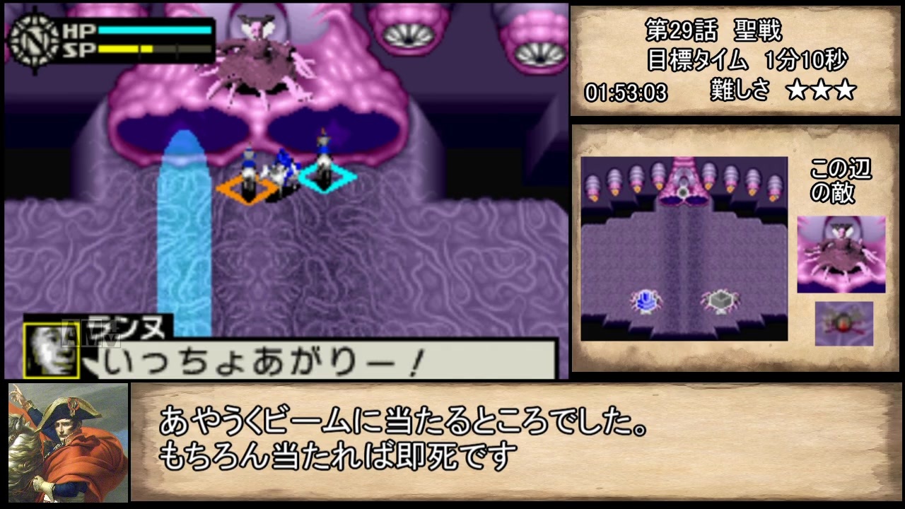 <span style="color: #ff0000; font-size: 24px;">再走</span><span style="color: #262626; font-size: 24px;">という言葉は、フランス的ではない</span><span style="color: #262626; font-size: 18px;"> </span><span style="color: #262626;">-ナポレオン・ボナパルト-</span><br><br>再走した結果、<span style="color: #ff0000;">1時間44分24秒</span>まで短縮しました。無編集なのでYouTubeに上げました→<a href="https://www.youtube.com/watch?v=ldnINaVj4b8" target="_blank" rel="noopener nofollow">https://www.youtube.com/watch?v=ldnINaVj4b8</a><br><br>(追記)急いで編集したせいで広告者様の紹介を完全に入れ忘れてました。申し訳ありません。これまでのご視聴、コメント、広告など本当にありがとうございました!<br>旗振りのGB素材、作りました→<a href="https://www.nicovideo.jp/watch/sm37329647" class="watch">sm37329647</a><br><br><a href="https://www.nicovideo.jp/watch/sm37313241" class="watch">sm37313241</a>←前 <a href="https://www.nicovideo.jp/mylist/68959563" target="_blank" rel="noopener">mylist/68959563</a> 次回作→<a href="https://www.nicovideo.jp/watch/sm37502008" class="watch">sm37502008</a><br><br><span style="color: #000000; font-size: 14px;">part1→<a href="https://www.nicovideo.jp/watch/sm37196942" class="watch">sm37196942</a></span><br><br>