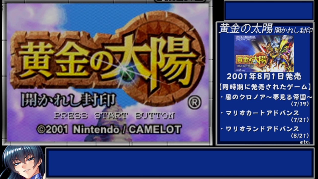 (biim式RTAは)初投稿です。<br><br>いろいろと頑張って説明しているつもりですが<br>RTAじゃゲームそのものの面白さは全部伝えきれないから<br>みんなも『黄金の太陽』をやろうね!<br><br>【レギュレーション】<br>リターンバグを含む、一切のバグの使用禁止<br>神殿復帰というテクニックの使用を禁止<br><br>【計測区間】<br>計測開始地点:最後のキャラの名前入力決定後<br>計測終了地点:To Be Continuedとタイトルが完全に表示されるまで<br><br>【環境】<br>ゲームキューブ実機(ゲームボーイプレーヤー使用)<br>GV-USB2<br><br><br>プロローグ~シーフマスター撃破まで<br><br>次⇒<a href="https://www.nicovideo.jp/watch/sm37331180" class="watch">sm37331180</a><br>このRTAのマイリスト⇒<a href="https://www.nicovideo.jp/mylist/69225102" target="_blank" rel="noopener">mylist/69225102</a><br><br>偉大なる先駆者兄貴の動画⇒<a href="https://www.nicovideo.jp/watch/sm34096063" class="watch">sm34096063</a><br><br>【8/13追記】<br>5,000再生とたくさんのコメント、そしてたくさんの広告ありがとうございます!<br>残りのPartもきっちり編集しておりますので、お待ちくださいませ!<br><br><br><span style="color: #ff0000; font-size: 10px;">今回はほとんどプロローグで話が進んでないから<br>次のパートまで見て!お願いします!なんでも…</span><br><br>